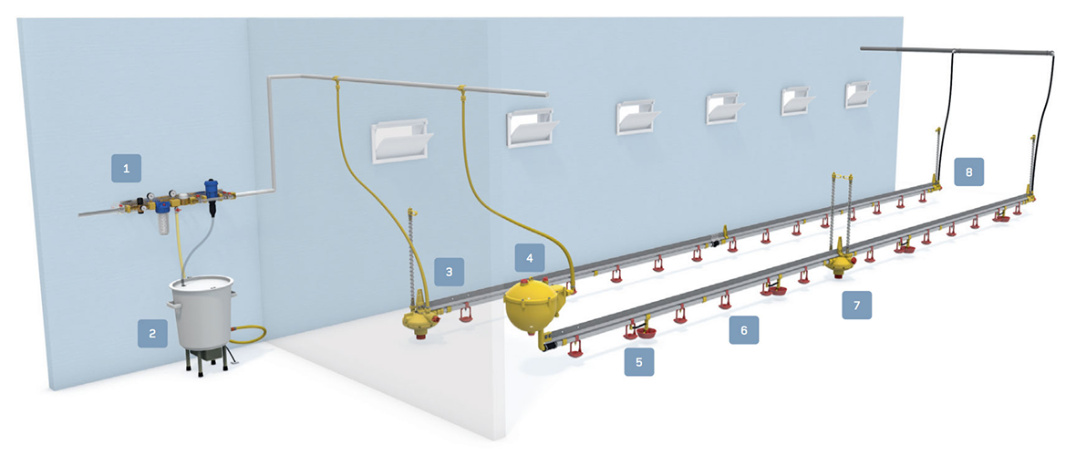 Це сучасна система, яка безперервно подає чисту, дозовану воду птиці протягом усього періоду вирощування — від маленького курчати і до дорослої особини. Вона повністю автоматизує процес напування, дозволяючи фермерам забути про постійний ручний догляд.Система контролює тиск, фільтрує воду та точно регулює її витрату. Завдяки цьому зменшуються ризики перезволоження підстилки, виникнення захворювань і людських помилок. Це — не просто зручність, а важливий елемент, що впливає на здоров’я птиці та стабільність роботи всієї ферми.
