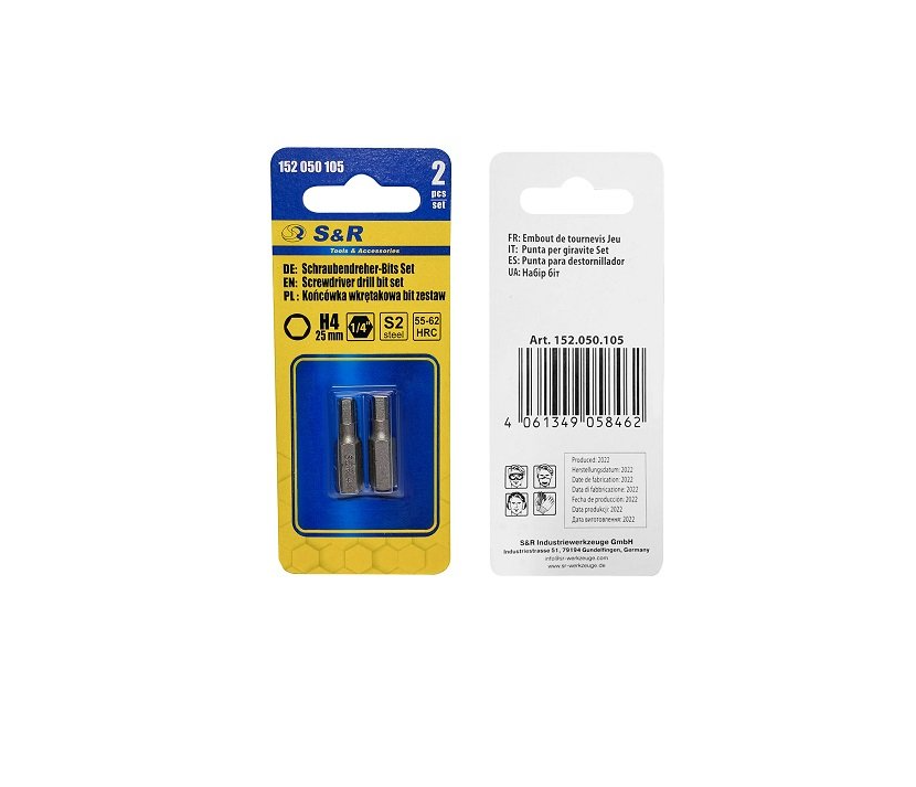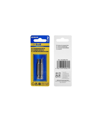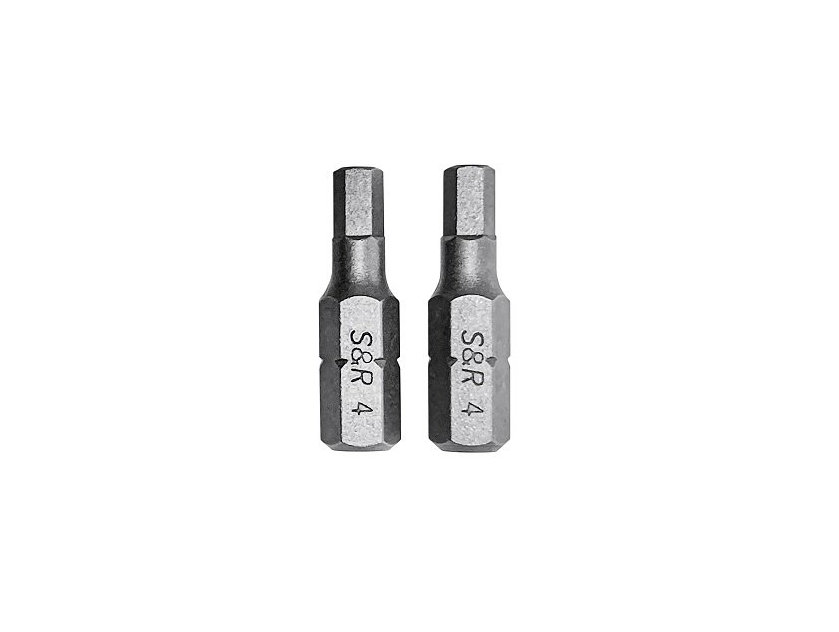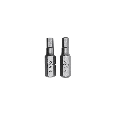 Біти S&R Hex4 x 25 мм 2 шт - насадка для шуруповерта або викрутки зі змінними бітами. Виготовлені із сталі S2 твердістю 55-62 HRC, яка має високий вміст вуглецю та хрому. Завдяки цьому біти підходять для інтенсивного використання разом із шуруповертами. Точний профіль. Посадковий шестикутник ¼ дюйма. Форма – шестигранник Hex4. Довжина біти – 25 мм. У наборі – 2 біти. Поставляється у блістерній упаковці. Країна бренду: Німеччина.