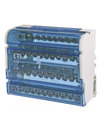 ETI Блок розподільчий EDB-207 2p, L+PE/N, 125A (7 виходів) ETI EDB-207 — це двополюсний розподільчий блок з номінальним струмом 125 А, призначений для ефективного та безпечного розподілу електроенергії в однофазних і трифазних електрощитах. Ідеальне рішення для монтажу в побутових, комерційних і промислових електроустановках.Переваги та гарантія