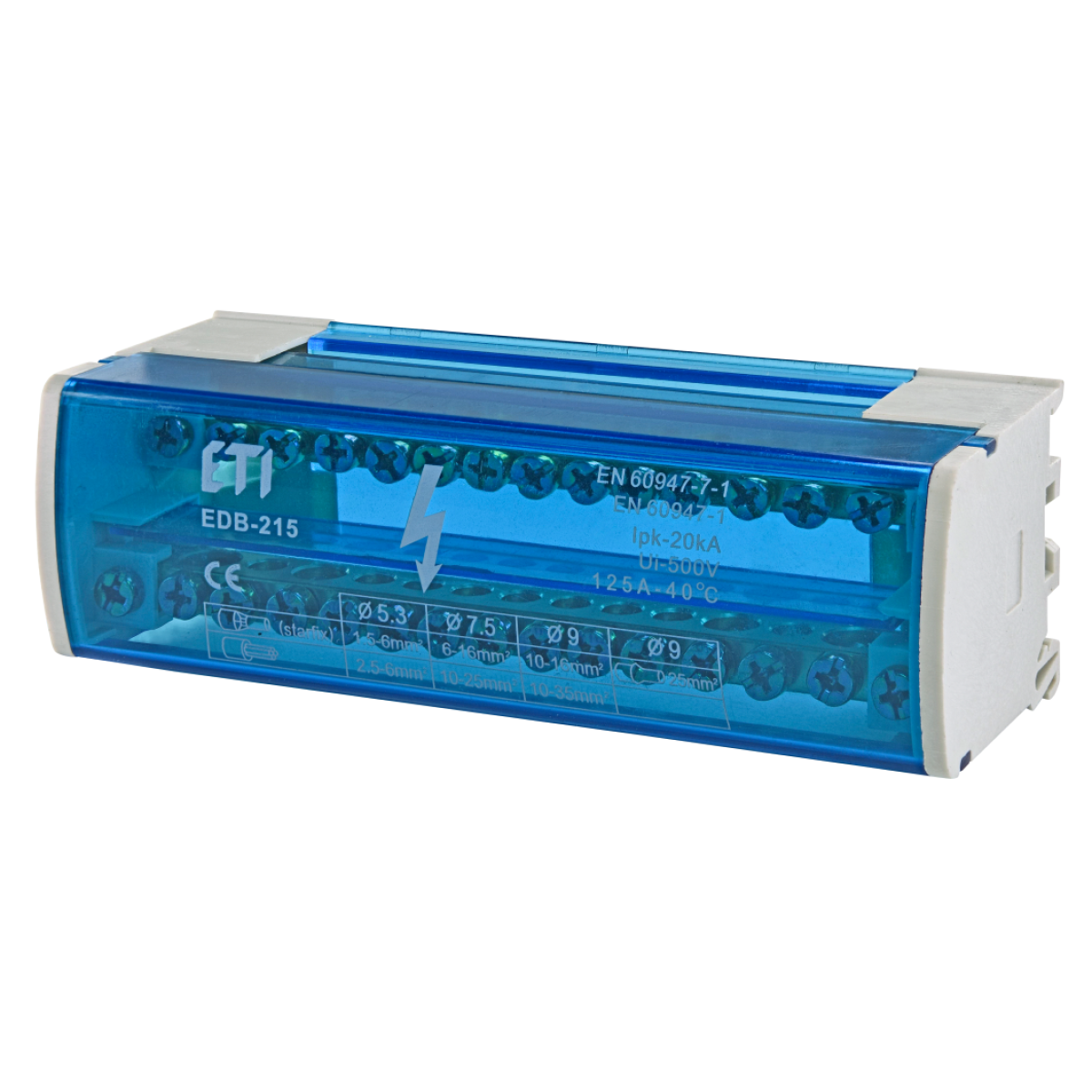 Характеристики Блок розподільчий ETI EDB-215 2p, L+PE/N, 125A (15 виходів) (001102302)