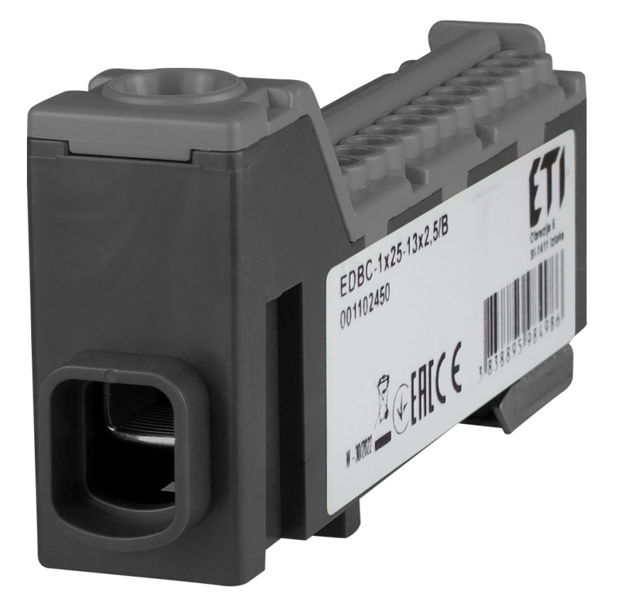 ETI EDBC-1×25-13×2,5/B — це однополюсний розподільчий блок, призначений для роботи у високовольтних системах змінного або постійного струму. Завдяки компактному дизайну та зручному формату підключення (1 вхід до 25 мм² / 13 виходів до 2,5 мм²), він ідеально підходить для монтажу в електрощитах із великою кількістю малопотужних споживачів. Чорний колір корпусу дозволяє зручно маркувати лінії за фазами або призначенням.Переваги та гарантія