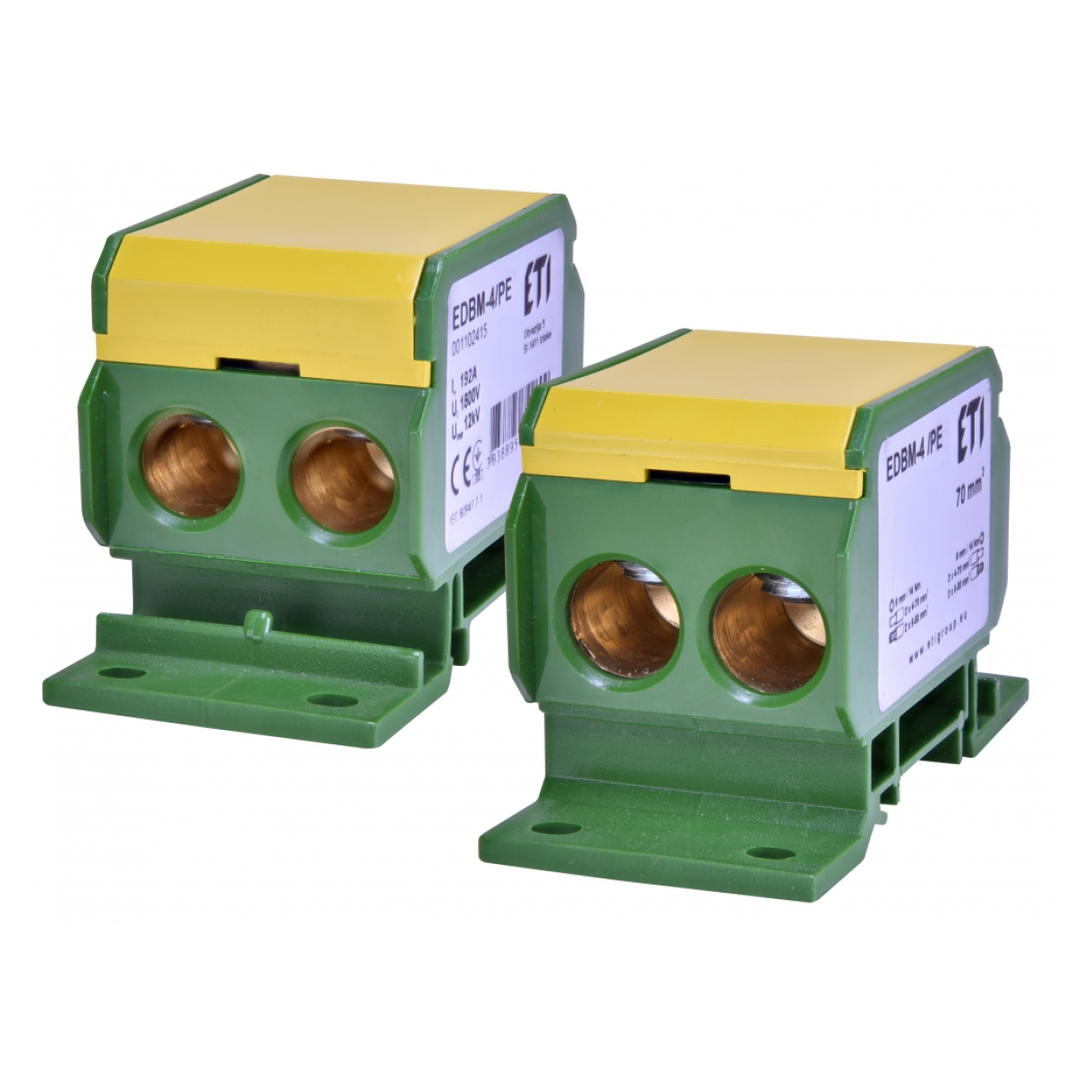 ETI Блок розподільчий EDBM-4/PE — надійний блок для підключення захисного провідника (PE) у потужних AC/DC системах. Жовто-зелений корпус для чіткої ідентифікації заземлення.Переваги та гарантія