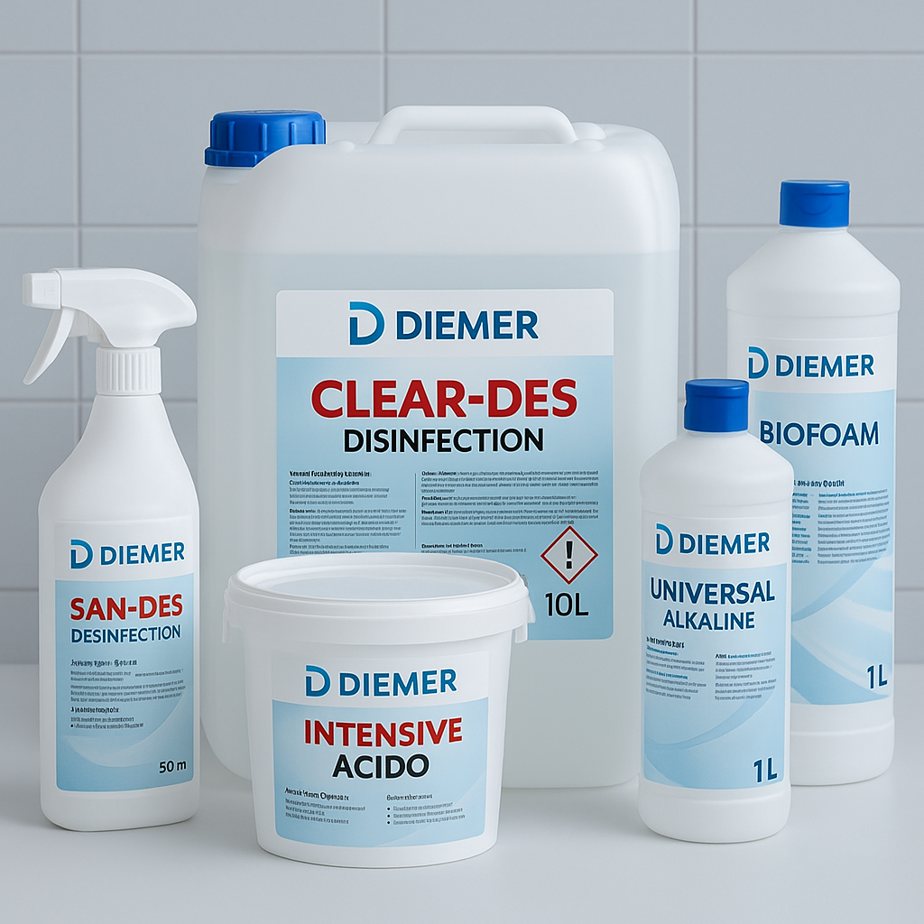 Diemer пропонує широкий асортимент професійних засобів, основний акцент роблячи на продукти для очищення та дезінфекції Diemer. До асортименту бренду входять: