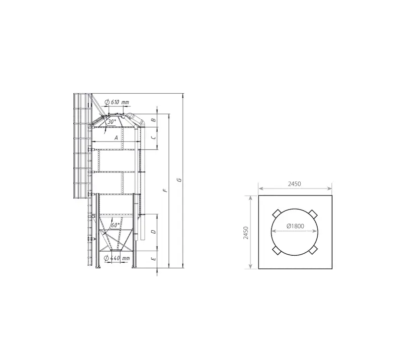 Діаметр 1,8 м; Місткість 4,2 м3; Місткість корму 2,8 т. Кормовий бункер призначений лише для завантаження кормами з максимальною густиною до 650 кг/м3. Кормовий бункер повинен бути встановлений і вирівняний так, щоб усі його ніжки не відрізнялися за рівнем фундаменту від однієї контрольної точки на +/- 2 мм. Ноги зібраного бункера повинні мати ідеальне вертикальне положення і розташовуватися в багатокутнику з рівними сторонами і діагоналями. Розвантаження кормового бункера після заповнення зменшується. Пристрої, які встановлюються під конусом (між конусом а підлогою) не можуть бути щільно встановлені, але мати телескопічні з'єднання з кроком не менше 1 см. Кормові бункери в стандартному виконанні призначені для установки на тензодатчиках з товстою і жорсткою верхньою затискною пластиною. Кормові бункери у стандартному виконанні не призначені для встановлення на експедиторських та проїзних конструкціях, оскільки їх конструкція не забезпечує динамічного гравітаційного розвантаження. Кормові бункери у стандартному виконанні призначені для помірних кліматичних зон: навантаження вітру 30 м/c, сніг навантаження 1,2 кН. Кормові бункери призначені для встановлення методом підйому до вертикалі змонтованої ємності, але з використанням додаткових дерев'яних або металевих скоб/посилень для ніг, описаних в інструкції.Переваги та гарантія
