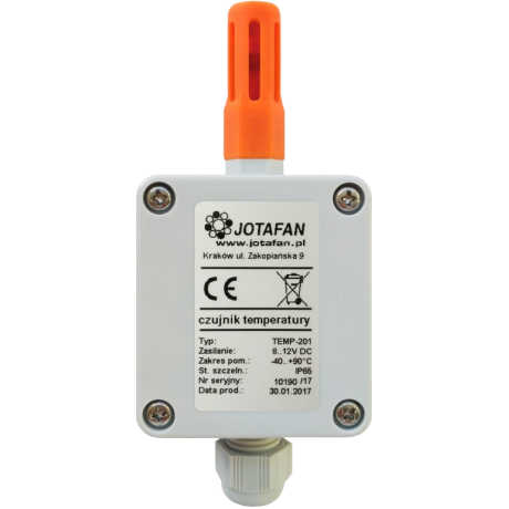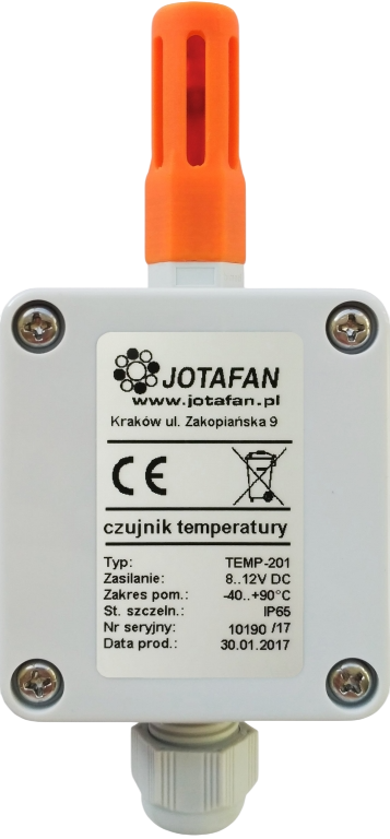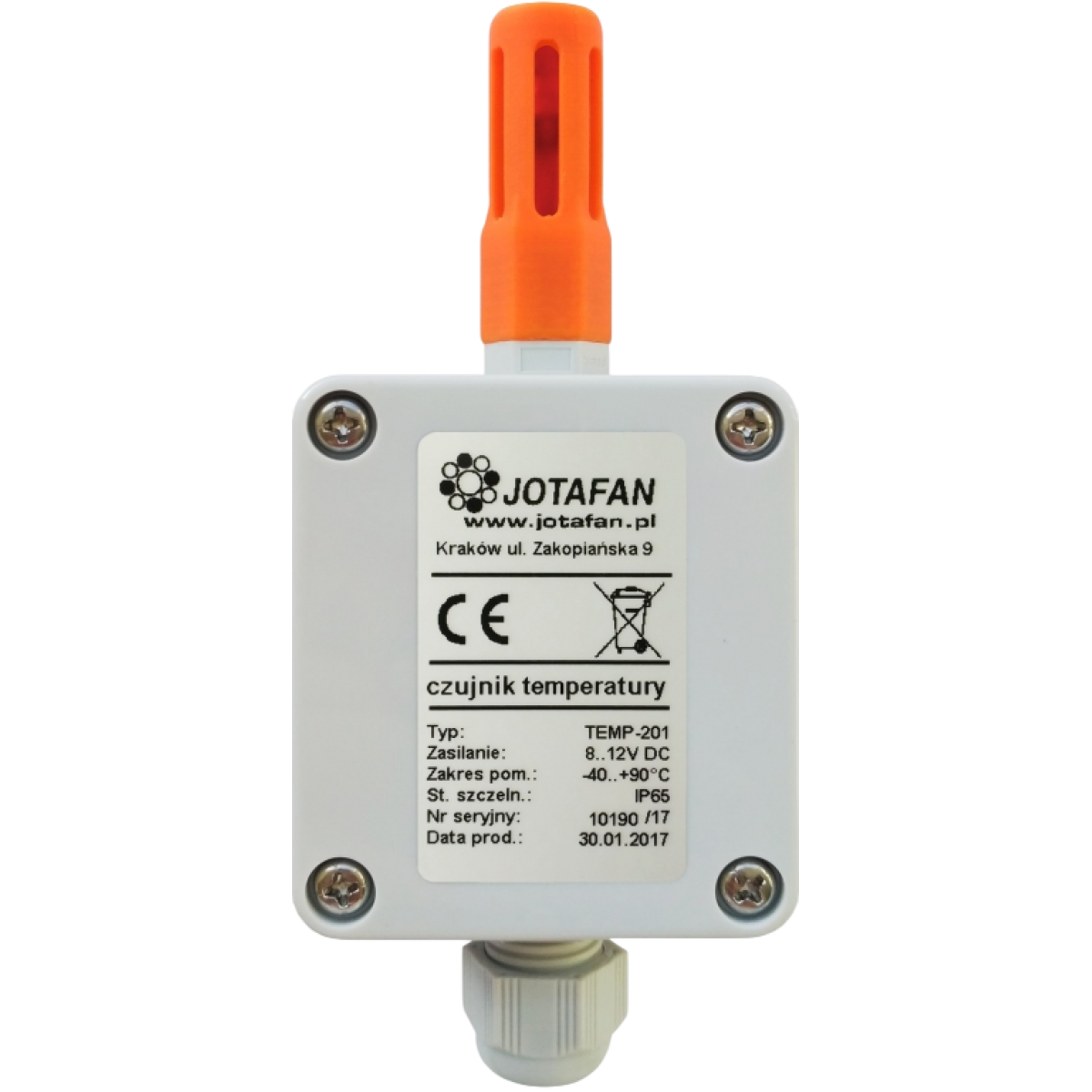 Датчик TEMP-201 Датчик TEMP-201 - це прилад для вимірювання температури повітря, виготовлений на основі сучасного цифрового датчика заводської градуювання. Датчик адаптований для цифрового зв'язку з іншими пристроями системи JOTAFAN, замінюючи датчики TEMP-01, що використовувалися досі. Для підвищення надійності роботи датчика корпус оснащений ручкою-застібкою, що дозволяє швидко закріпити датчик (до з’єднувального кабелю) у відповідному положенні, тобто кабельним вводом вниз. Такий спосіб кріплення підвищує захист датчика від вологи, яка може потрапити всередину, стікаючи по кабелю через кабельний сальник.Переваги та гарантія