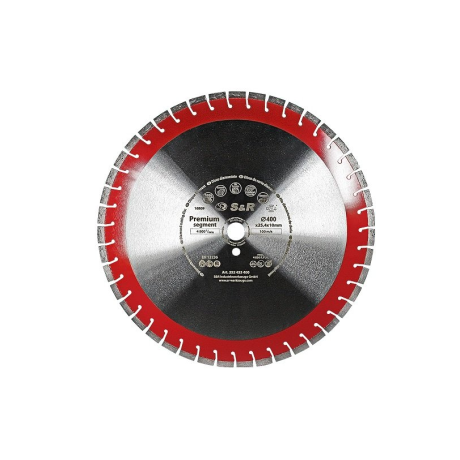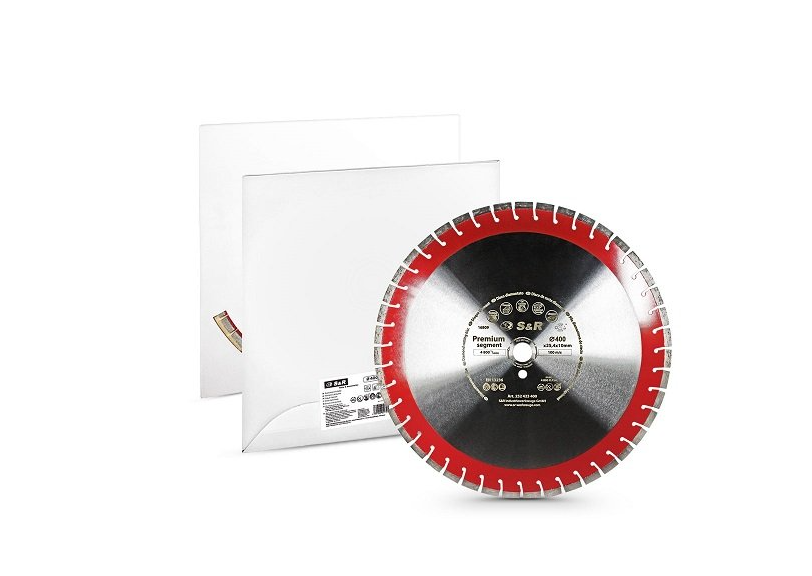 S & R Premium Segment 400х25,4 мм - алмазний відрізний диск для роботи по бетону, армованому бетону, старому бетоні і пісковику. Диск серії Premium Segment призначений для професійної роботи з високими навантаженнями. Якісні алмазні матеріали, а також висота алмазного напилення 10 мм забезпечують диску високу продуктивність. Сегменти прикріплені до основи диска за допомогою лазерного зварювання, що збільшує можливість працювати при високих навантаженнях і на оборотах до 4800 об / хв. Завдяки сегментной формі диска він не так швидко нагрівається і відповідно виконує роботу довше без перерв. Добре збалансована основа зменшує вібрацію на інструменті, наприклад швонарезчик або борозник, що забезпечує точний розріз по бетону. S & R Premium Segment 400х25,4 мм - алмазний диск високої якості для виконання професійних робіт на будівельному об'єкті.Переваги та гарантія