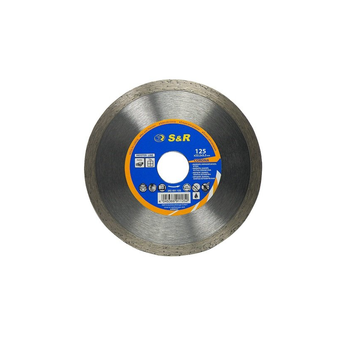 S & R Meister CORONA по керамограніту 125 мм. - відрізний алмазний диск, призначений для роботи з таким матеріалом: керамограніт, камінь, мармур, керамічна плитка. Коло товщиною 1,6 мм., І висотою сегмента - 5,5 мм.Переваги та гарантія