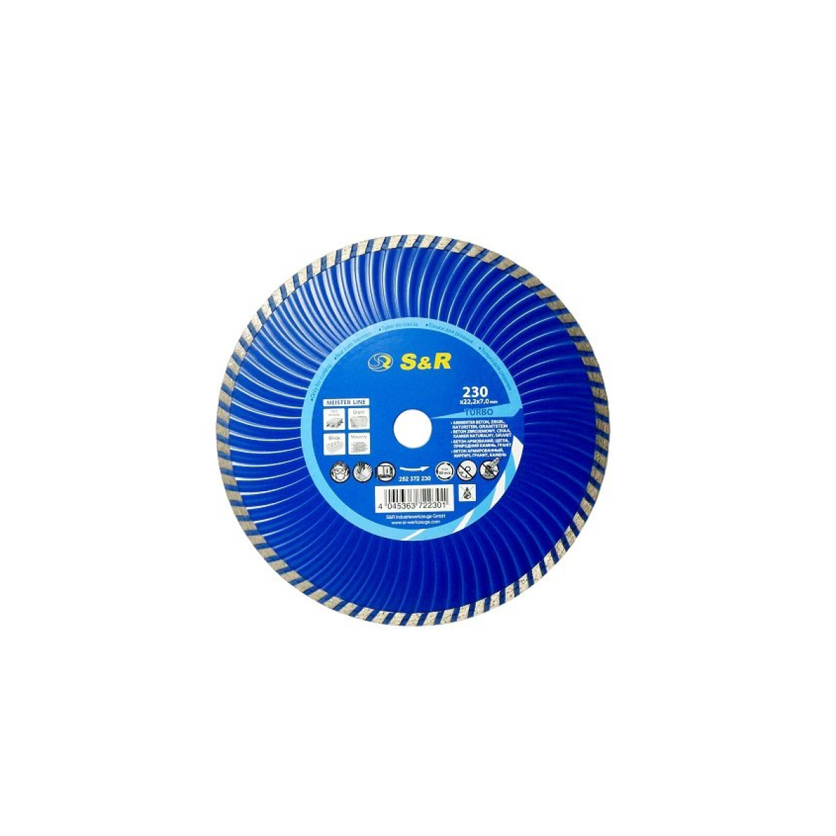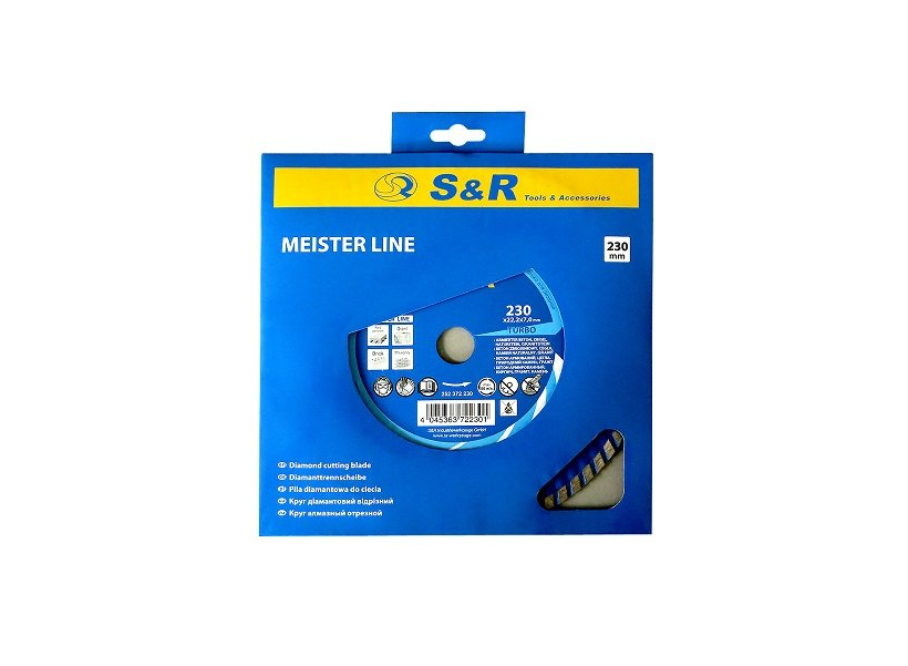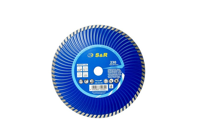 S & R Meister по армованому бетону 230 мм. - відрізний алмазний диск серії TURBO, призначений для роботи з таким матеріалом: армований бетон, природний камінь, твердий граніт. Коло товщиною 2,6 мм., І висотою сегмента - 7 мм.Переваги та гарантія