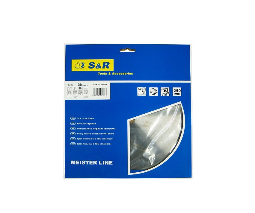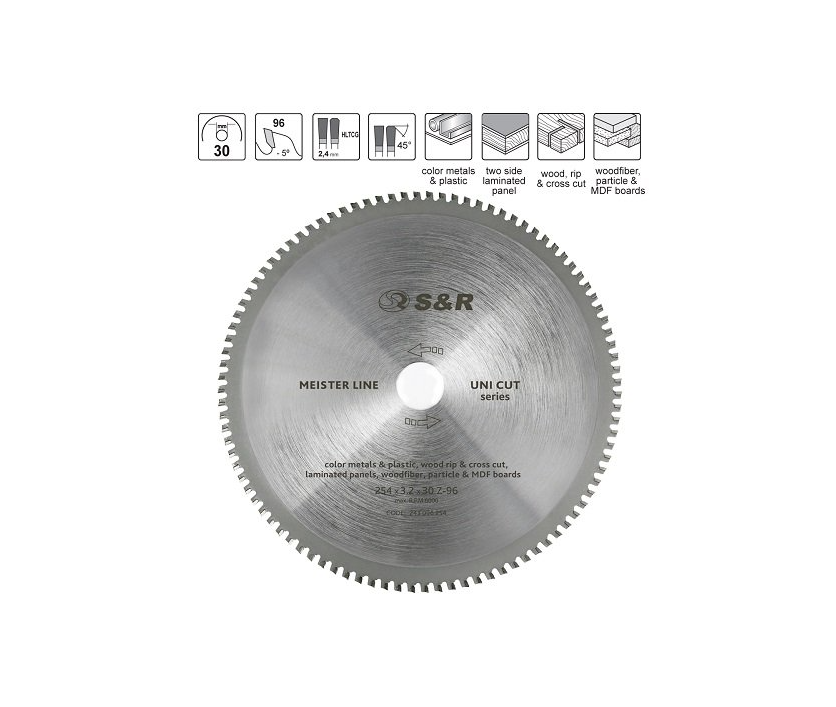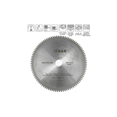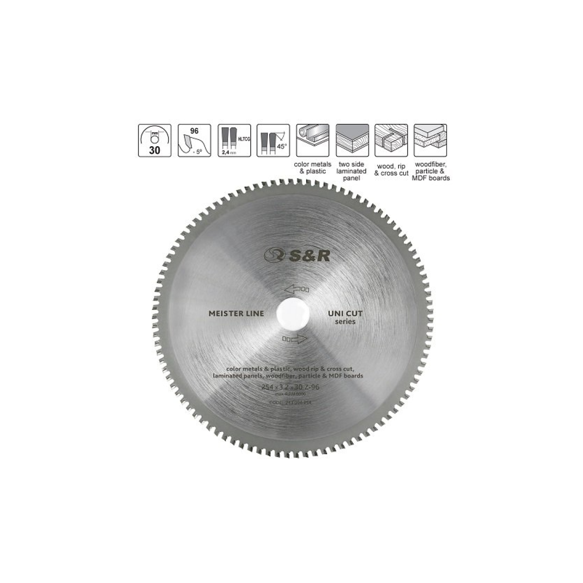 S & R Meister UniCut 254x30х3,2 мм - універсальний пильний диск для розпилювання різних видів дерева і містять деревину матеріалів, а також пластика, кольорових металів, ламінату. Завдяки 96 зубах HLTCG форми, диску під силу впорається з різним видом матеріалу на високій швидкості. Диск S & R UniCut 254x30х3,2 мм виготовлений з міцної сталі товщиною 3,2 мм, чисто і рівно справляється з важкою роботою. Пиляльний диск S & R UniCut серії Meister це універсальний витратний інструмент для Вашої торцевої пили, дискової пили і розпилювального верстата.Переваги та гарантія