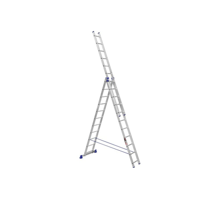 Stark SVHR3x11 - драбина, яка складається з 3-х секцій по 11 ступенів, що дозволяє виконувати будівельні та ремонтні роботи на висоті до 7 м 92 см. Сходи мають 3 рівні, завдяки чому можна використовувати сходи для роботи на різній висоті: використання як драбини висотою 310 см, драбина з додатковою секцією заввишки 504 см і пряма сходи висотою 702 см. Сходи виготовлена з міцного алюмінієвого профілю товщиною 1,2 мм, розмір профілю - 71,5х20 мм, що дозволяє витримувати навантаження до 150 кг і надійно працювати на сходах. Ніжки обладнані спеціальними заглушками, які запобігають ковзанню драбини по поверхні. Широка основа на одній зі сторін забезпечує стійкість сходах. Сходи надійно фіксується в робочому стані для безпечного використання. Сходинки виготовлені з алюмінію шириною 33, 39 і 44 см, що дозволяє комфортно працювати на сходах. Універсальна драбина Stark SVHR3x11 полегшить виконання завдань на професійному об'єкті.Переваги та гарантія