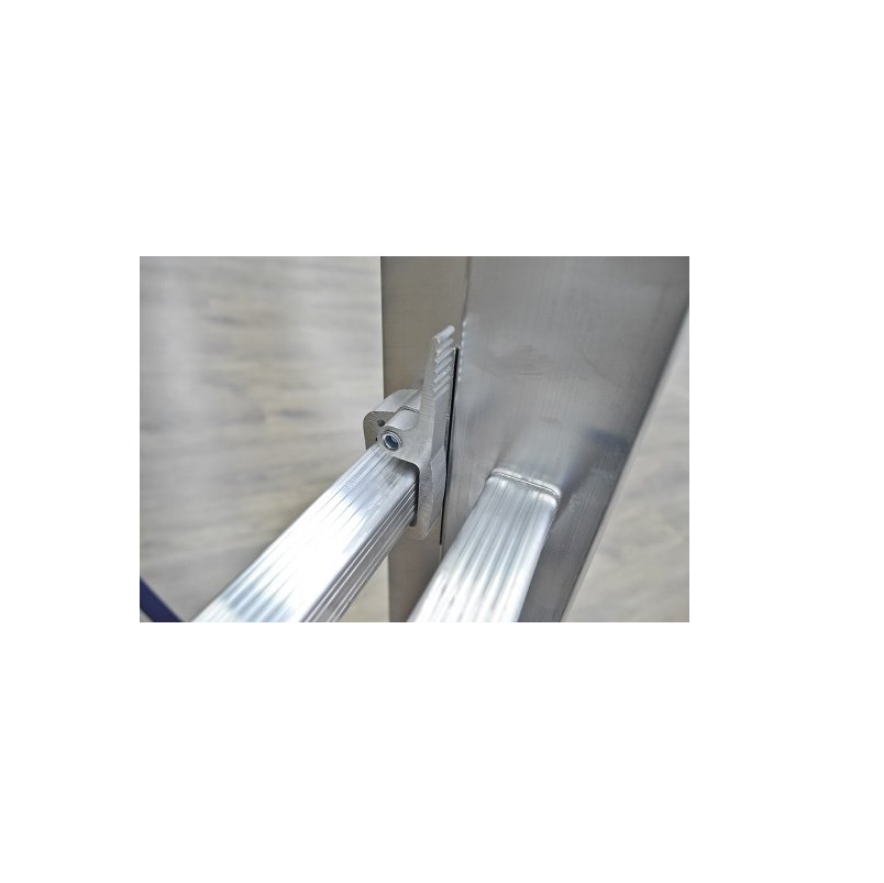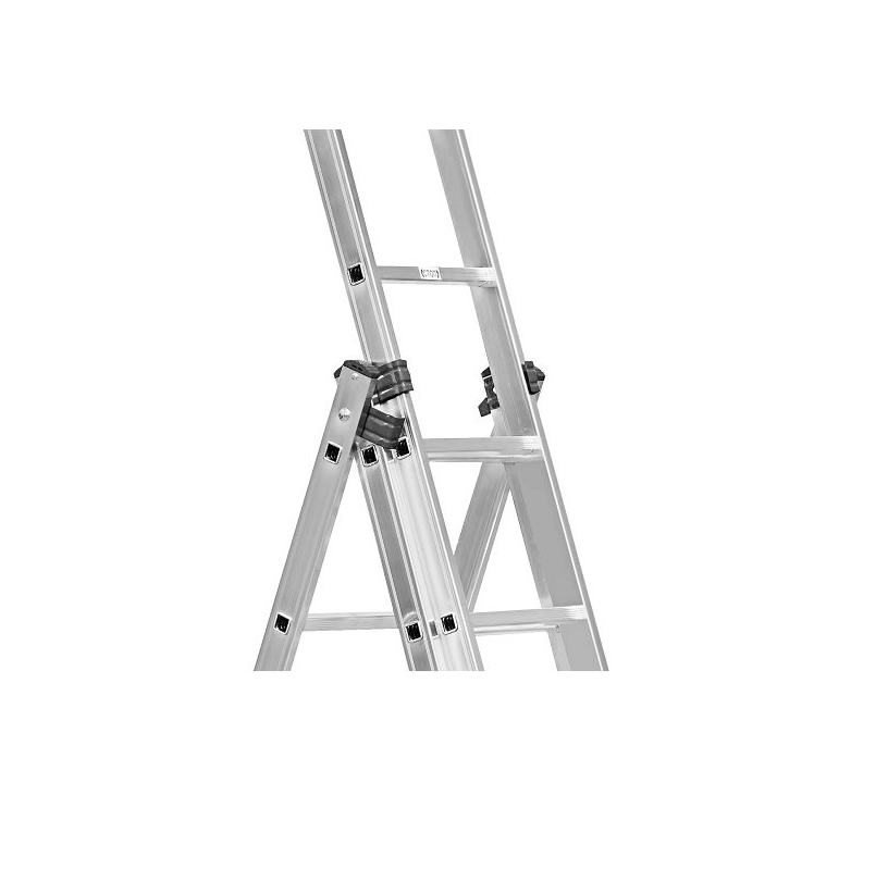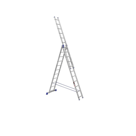Stark SVHR3x12 - драбина, яка складається з 3-х секцій по 12 ступенів, що дозволяє виконувати будівельні та ремонтні роботи на висоті до 8 м 76 см. Сходи мають 3 рівні, завдяки чому можна використовувати сходи для роботи на різній висоті: використання як драбини висотою 338 см, драбина з додатковою секцією заввишки 560 см і пряма сходи висотою 786 см. Сходи виготовлена з міцного алюмінієвого профілю товщиною 1,2 мм, розмір профілю - 71,5х20 мм, що дозволяє витримувати навантаження до 150 кг і надійно працювати на сходах. Ніжки обладнані спеціальними заглушками, які запобігають ковзанню драбини по поверхні. Широка основа на одній зі сторін забезпечує стійкість сходах. Сходи надійно фіксується в робочому стані для безпечного використання. Сходинки виготовлені з алюмінію шириною 33, 39 і 44 см, що дозволяє комфортно працювати на сходах. Велика промислова драбина Stark SVHR3x12 полегшить виконання професійних завдань.Переваги та гарантія