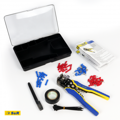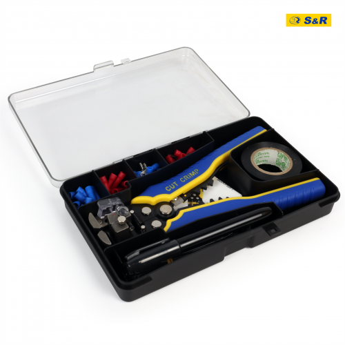 S&R 3-in-1 automatic insulation stripper with a set of accessories - a set that includes a multifunctional insulation stripper, insulated terminals, ties and a marker. Features of the S&R 3-in-1 insulation stripper: Allows you to perform the following operations: stripping wires, insulation, crimping, cutting. The stripper has the function of automatically stripping wires with a cross section of 0.2-6 mm2. Made of durable alloy steel. Convenient adjustment with a handle. The tool can be used as crimping pliers for insulated and non-insulated terminals. Allows you to easily cut wires thanks to sharp induction-hardened blades. The total length of the stripper is 205 mm. The set contains 98 items. The weight of the insulation stripper is 324 grams. Weight with packaging is 800 grams. Package dimensions: 220x145x38 mm. Brand country: Germany. Package contents: Insulation stripper – 1 pc.; Insulated terminals – 70 pcs.; Cable ties 3x100 mm – 25 pcs.; Insulating tape 5 m – 1 pc.; Marker – 1 pc.; Plastic case.Benefits and warranty