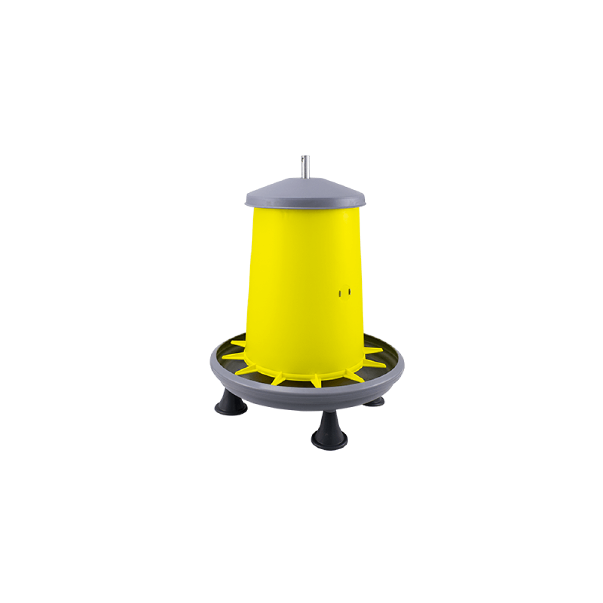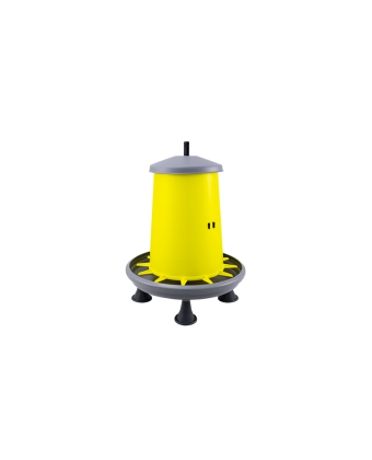 9L hopper feeder with central metal rod and feet. Hopper feeder with central metal rod and spikes, excellent for feeding both baby chicks and adult animals. It is supported by a vertical rod and a crossbar, both made of metal. The rod has three holes that allow as many levels of adjustment of the amount of feed in the dish. The adjustment is made by means of a cotter pin that fixes the plastic cylinder at the desired height. The hole at the top of the rod allows the feeder to be hung. The feeder comes complete with a lid that protects the feed from dirt. Supplied with a kit of 4 feet to be inserted into the appropriate slots at the base of the plate to raise the feeder 65 mm above the ground, thus ensuring cleaner feed and facilitating adult animals.Benefits and warranty