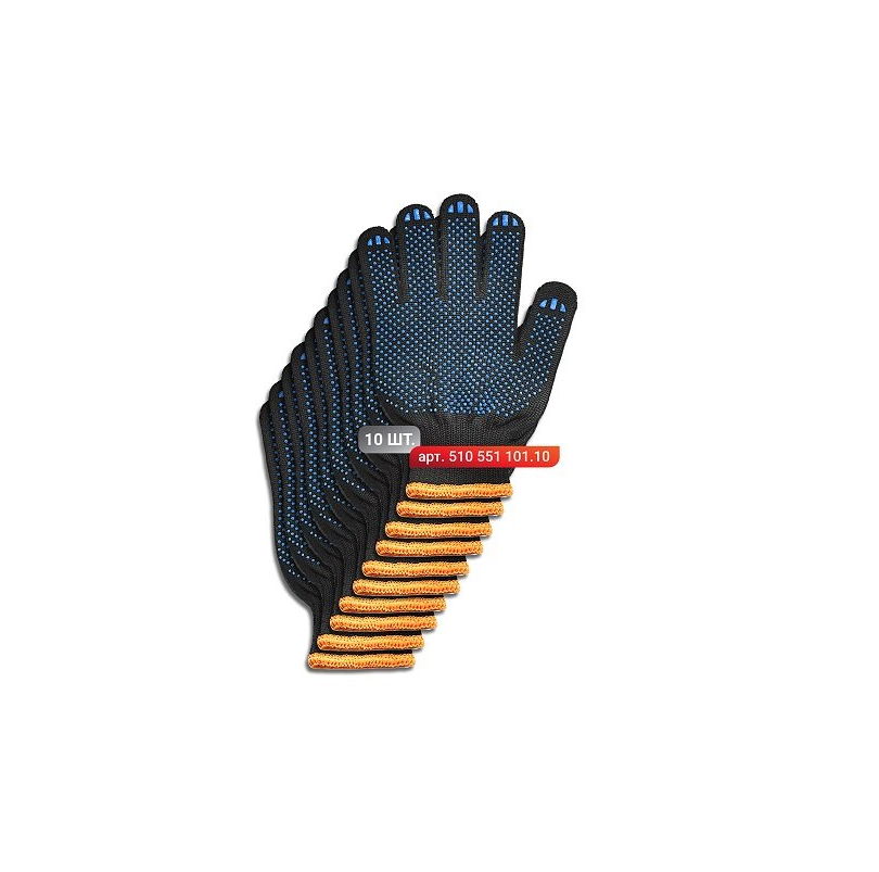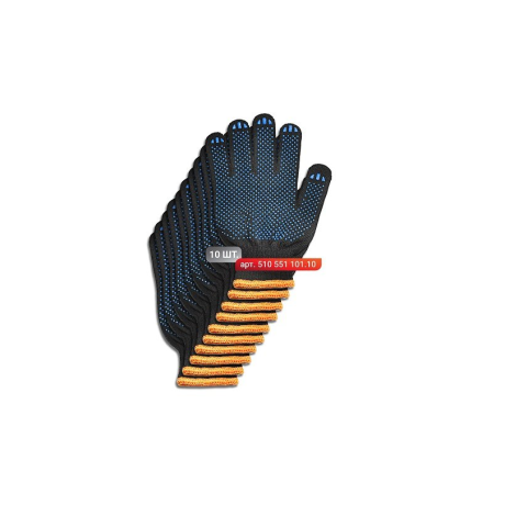 Stark Black 5 thread gloves with enlarged PVC dots for hand protection during various mechanical work. They are used in construction, repair, and painting. The set includes 10 pieces, which are enough for a team of workers or for long-term use by 1-2 workers. They are made by the “plating” method, due to which cotton threads go under the inside of the glove, and synthetic threads on top. Thanks to this type of knitting, gloves are more comfortable to work with and have greater wear resistance. They consist of 60% cotton and 40% polyester. The cuff of the glove has an elastic band that is conveniently fixed on the hand. A large PVC pattern is applied to the work surface to prevent slipping. Density of 220 tex will provide gloves with a long service life, as well as make it possible to work in the cold season. Knitting class 7 means that the gloves are elastic and will fit well on the hand.Benefits and warranty