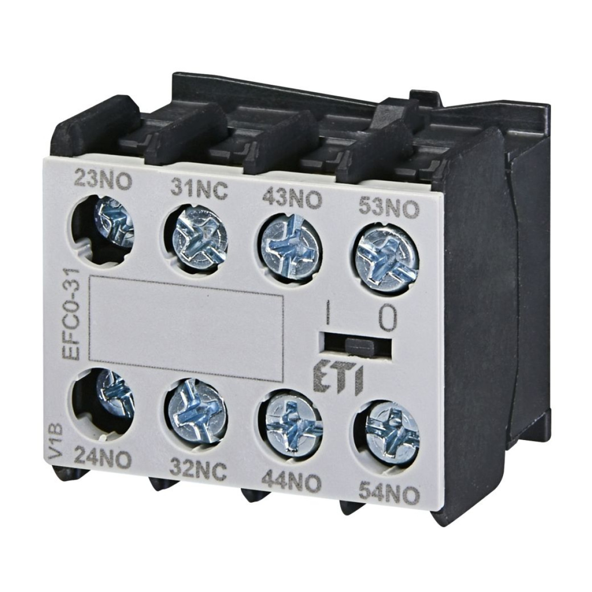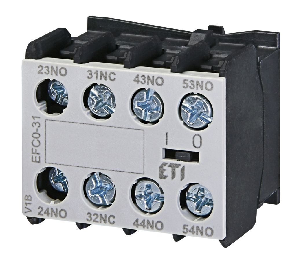 ETI Auxiliary Contact Block EFC0‑31 (3NO+1NC, for 3‑pole CEC contactors) — front‑mounted module with three normally open and one normally closed contact. Ideal for 3‑pole systems requiring combined ON‑state indication and fault detection for enhanced control flexibility.Benefits and warranty