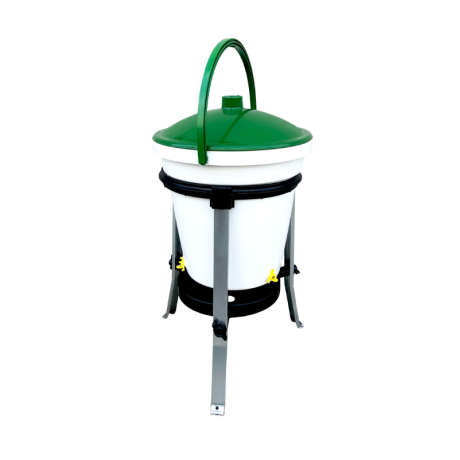 The ideal trough to keep water clean and healthy. The RIVUS bucket drinker is the ideal solution for watering backyard poultry with clean and waste-free water. The bucket has three holes where you can screw in the Stilla troughs supplied separately. Other optional Stilla can be added as required and according to the species bred by drilling the necessary holes next to the existing ones following the instructions below. With an easily removable lid, the water inside the bucket always remains protected from the weather and impurities, ensuring better animal health. The RIVUS bucket drinker has a sturdy handle that allows the container to be lifted for filling, leaving the solid base with 3 metal legs always in place.With its capacity of 17 litres, the bucket trough ensures that water is always available to the animals for several days. The Rivus bucket trough comprises. Complete base: Equipped with 3 galvanised metal legs for durability and high strength, attached to a nylon ring that acts as a support for the bucket with a circular reinforcement that makes the structure compact and stable. It can be anchored to the ground thanks to the holes in the base. UV-resistant polypropylene bucket: Additivated with UV stabiliser, with a capacity of 17 litres, complete with handle and lid. The handle allows the bucket to be carried easily and the lid serves to keep the water protected from impurities at all times. Stilla drinking trough: screws into an 8.5 mm diameter hole. The conical shape of the threaded part allows a watertight seal. It can supply one animal at a time, increasing hygiene and reducing water waste. Advantages. Easy to assemble and use. Easy to clean and maintain. Capacity 17 litres. Hygienic bucket with lid for always clean and fresh water. Stilla horizontal drip troughs prevent water stagnation and the spread of disease and illness. Stable, robust and long-lasting base support. Easy to transport within the farm.Benefits and warranty