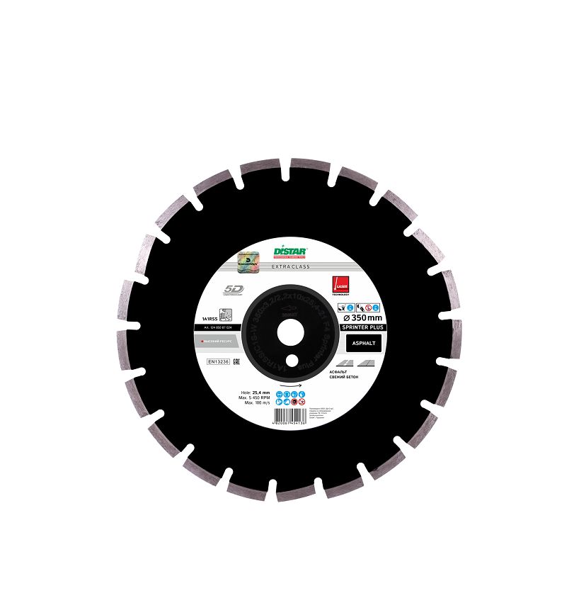 Di-Star Sprinter Plus 450x25.4 is a diamond blade for cutting fine-grained and coarse-grained asphalt and concrete. It is used with joint cutters with an average power of 5-13 kW. With a long cutting life, it is designed for large volumes of work. Diamond coating thickness - 3.8 mm. Number of segments, pcs.: 25.Benefits and warranty