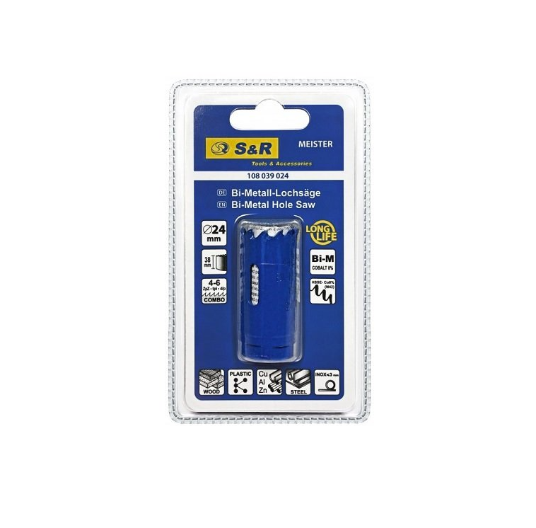 S&R Meister 24mm HSS-Co8% M42 circular saw is a bimetallic universal circular saw that can be used for sawing wood, drywall, plastic, steel, including stainless steel up to 3 mm thick. The main advantages of the S&R Meister 24mm circular saw: The diameter of the crown is 24 mm, the length is 50 mm. Made of durable steel. The teeth are made of high-speed steel with an 8% cobalt content. The teeth are arranged with a variable pitch of 4-6 teeth per inch. The maximum cutting depth is 38 mm. For dry cutting. Long service life. Supplied in blister packaging. Country of brand - Germany. Country of manufacture - China.Benefits and warranty