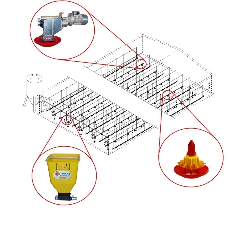 Automatic feeder for broilers Gio T/F on 12 sections (low cone) CODAF Italy is installed on poultry farms equipped with automatic feed distribution. It allows to improve the quality of feeding of birds, thus increasing productivity.