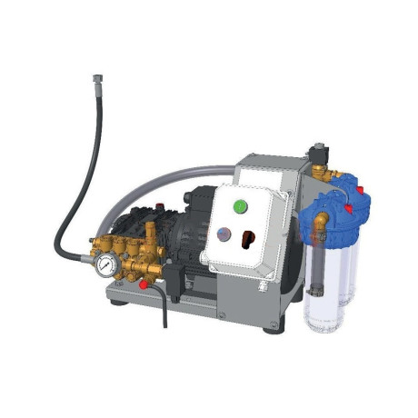 Compact Pump Unit type Exc 12-14 l/min - 70 bar - 3x400V - 50/60Hz The ExC pump unit contains an electric motor and a high pressure pump, a pressure regulator for limiting pressure, a pressure switch and pressure gauge for pressure monitoring, a thermal valve, a filter unit with 5 micron, 1 micron and a main valve and a control unit for controlling the system. The device is designed to be controlled using an external controller. The manual/0/auto switch can be used to switch between this automatic mode and manual continuous mode. The built-in bimetal relay can be reset using the blue reset button. A green illuminated button indicates readiness for operation when there are no faults. Built-in electronics control the pressure increase. If the pump runs for 20 seconds without a sufficient increase in pressure, or if the pressure drops for more than 3 seconds during operation, the device goes into emergency mode. In the event of a malfunction, the green LED goes out and the potential-free signal relay is disconnected.Benefits and warranty
