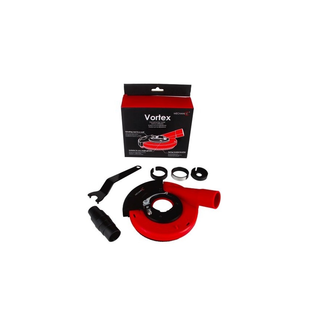 The Mechanic Vortex 125-230 mm grinding hood is designed to be installed on an angle grinder and connected to a dust extraction system. It allows you to grind concrete with minimal dust. Features of the Vortex grinding hood: The model has a universal fastening system, so it can be installed on any angle grinder with a disc diameter of 125-230 mm. The design provides for a spring-loaded brush along the edges of the cover, which does not allow dust to pass through and at the same time allows you to work with different types of grinding discs. The side cover of the guard can be opened for grinding near walls. Components: Guard; Clamping key; Spacer flange; Set of adapters for the gearbox; Rubber adapter.Benefits and warranty