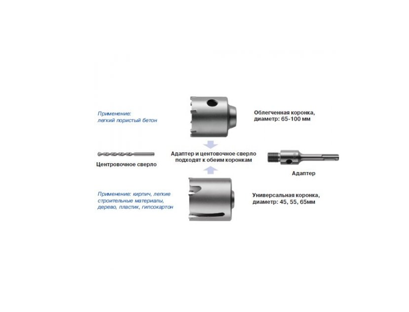 The lightweight S & R hollow core drill bit is used for fast drilling of large diameter holes in concrete, aerated concrete, brickwork and natural stone. The modular core drill bit allows you to save money as much as possible due to the possibility of using one set of accessories for different diameters of cores. The hollow core drill bit has: A convenient quick-release design; A special geometry of the cutting teeth; A quick-release fastening of the centering drill bit. The lightweight S & R hollow core drill bit is suitable for hammer drills from 2 to 4 kg with a SDS-plus or two-slot chuck type, drills with a three-jaw chuck and is used together with: S & R SDS-plus adapter with M16 thread; S & R adapter with a hexagon with M16 thread; S & R centering drill bit for brick Надіслати відгук Бічні панелі Історія ЗбереженоBenefits and warranty