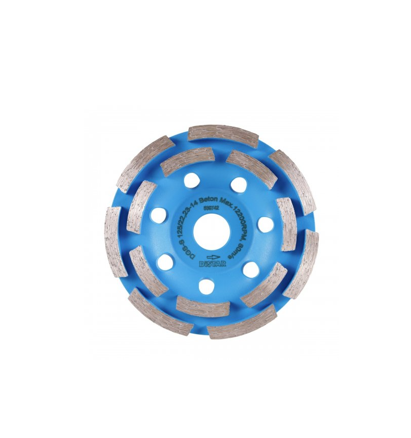 Distar 125/22.23x14 FAT Beton diamond grinding cup - designed for rough grinding of concrete (including reinforced concrete) and stone surfaces. Also suitable for removing excess material when pouring formwork, etc. Features of the Distar 125/22.23x14 FAT Beton diamond cup: Diameter - 125 mm. Mounting hole - 22.23 mm. Designed for installation on 125 mm angle grinders (KSHM). Has 2 rows of diamond segments on a lightweight metal base for best performance. Can be used at speeds of up to 12,200 rpm.Benefits and warranty