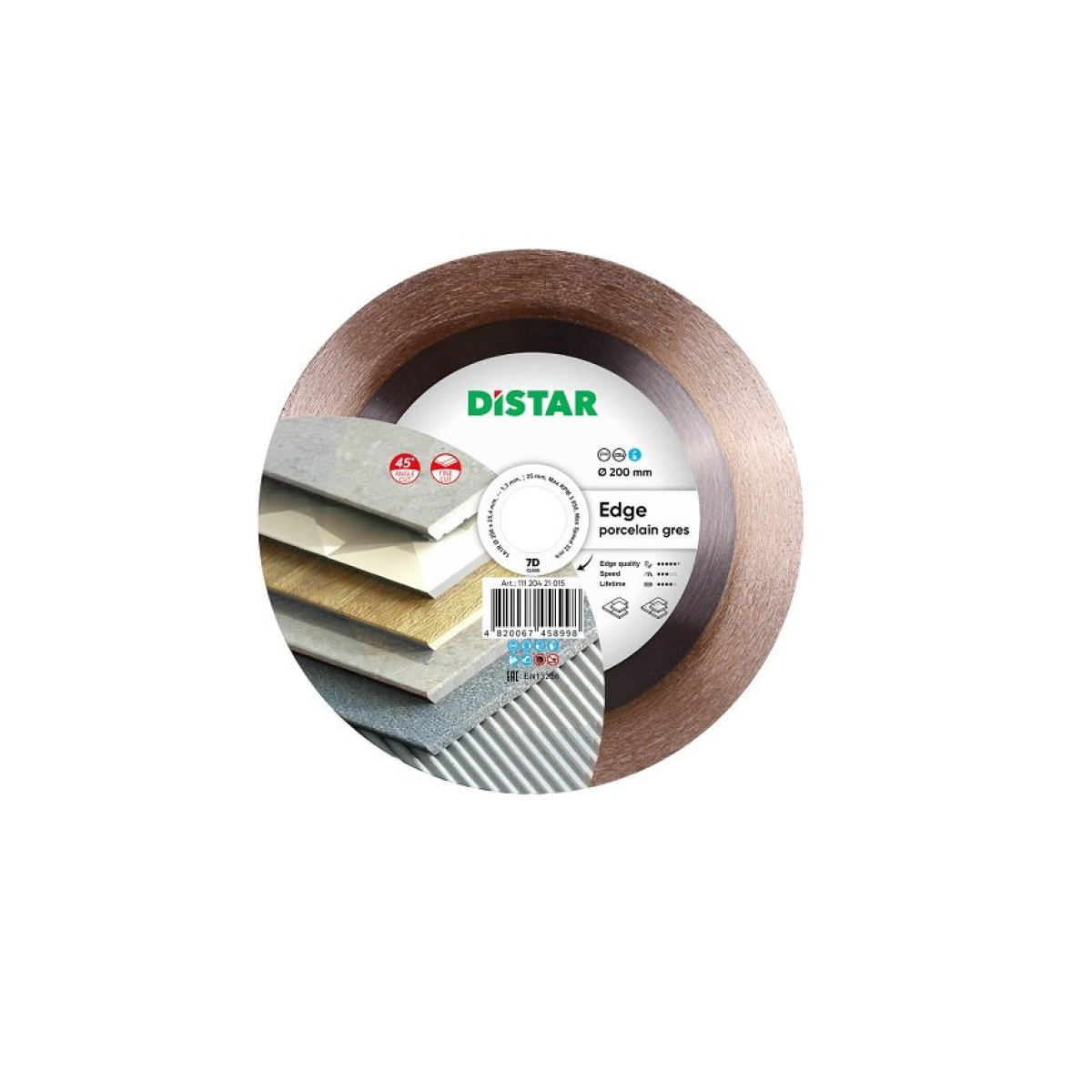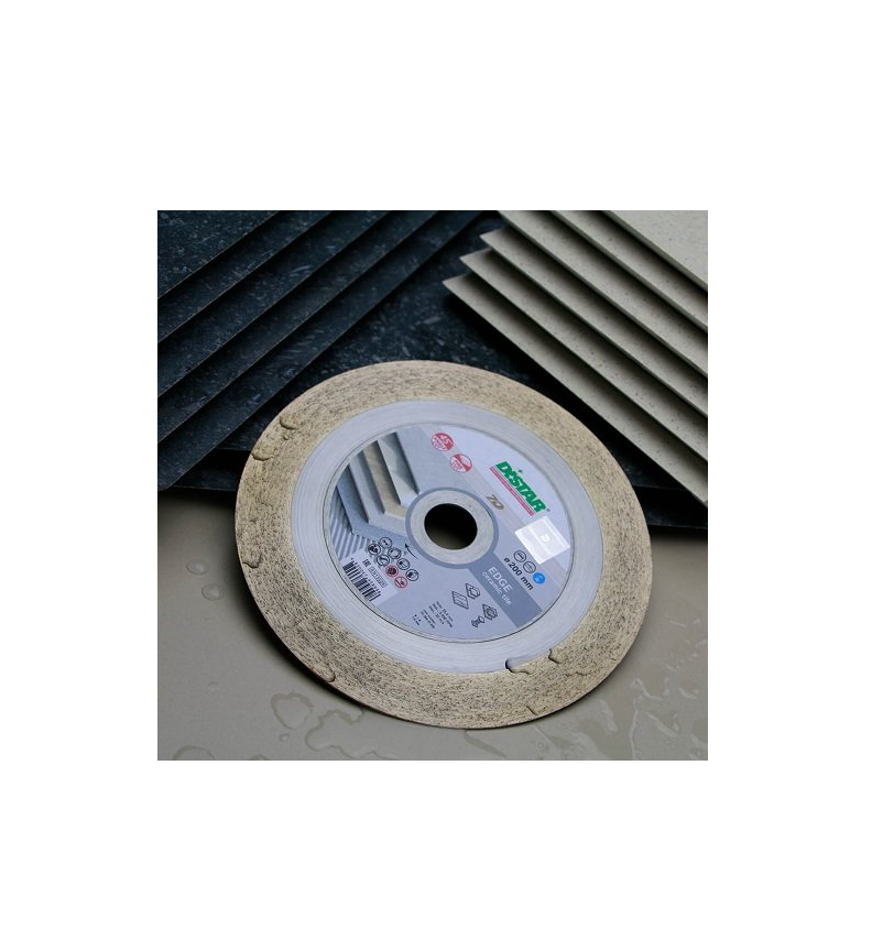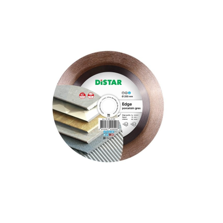 Distar 1A1R Edge is a diamond blade for cutting ceramic tiles and porcelain stoneware at a 45° angle. The special design of the blade with a thick hub ensures rigidity, allowing it to make precise and even cuts at an angle. The diamond layer is 25 mm thick, with a large diamond in the center and a small one around the edge, so the blade immediately provides edge grinding and a long service life. The Distar 1A1R Edge diamond blade works effectively with water-cooled tile cutters.Benefits and warranty