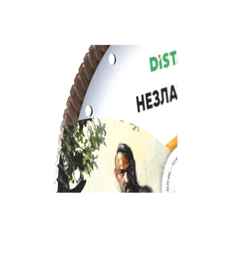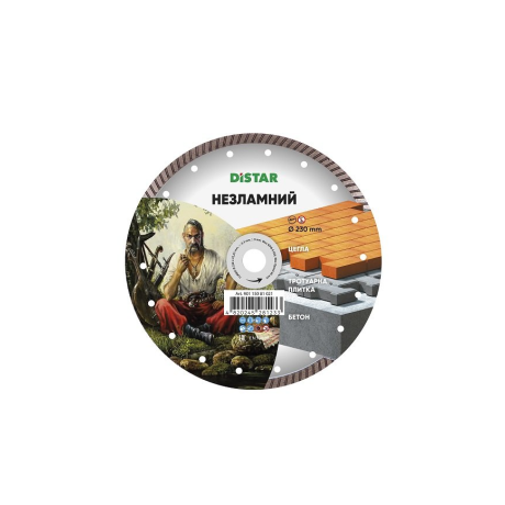Distar Unbreakable 230x2, 3x22, 23 mm diamond cutting disc - a tool for cutting unreinforced concrete, brick, and paving slabs. It features an exceptionally durable body and diamond layer. The developer was inspired to create this blade by the exploits of the Armed Forces of Ukraine. The blade features an image of Cossack Syrko resting after another victory. Features of the Distar Unbreakable diamond disc: Disc dimensions: diameter – 230 mm; thickness – 2.3 mm; mounting hole diameter – 22.23 mm. Diamond layer height – 9 mm. Can be installed on angle grinders. No cooling is required to work with the disc. Segment type: TURBO; Can be used at a maximum speed of 6650 rpm.Benefits and warranty