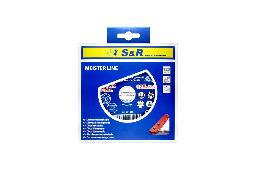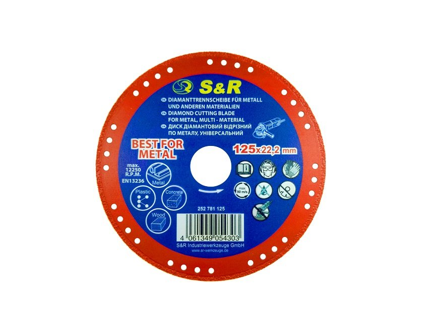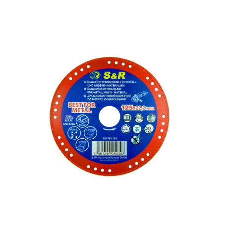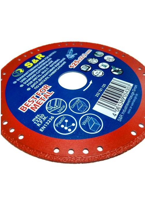 S & R 125x22.2 mm - a universal diamond cutting disc, which is ideal for working with metal, and also perfectly cuts wood, plastic, concrete, brick, etc. The S & R 125x22.2 mm diamond wheel is made by vacuum welding, which makes it resistant to high temperatures when operating at a maximum speed of 12250 rpm. Holes along the diameter of the wheel provide good cooling during operation, which affects its wear resistance. The S & R 125x22.2 mm diamond cutting disc is designed to work with small angle grinders.Benefits and warranty