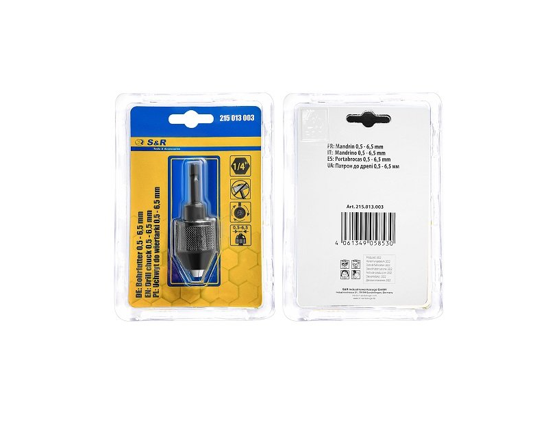 Drill chuck S&R 0.5-6.5 mm with adapter ¼" - an all-metal chuck for working with drills with a shank diameter from 0.5 mm to 6.5 mm, quick-clamping. Suitable for use with drills, screwdrivers, cordless screwdrivers. Features of the drill chuck SR with adapter: Long service life due to the all-metal design. Due to the adapter included, it is suitable for working with tools with a ¼" hexagon seat hole. Reliable system for attaching the adapter to the chuck. The chuck is quick-clamping, making it easy to change attachments. Supplied in blister packaging. Brand country: Germany.Benefits and warranty