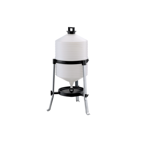 Constant level plastic tank drinker type 30L. Tripod plastic siphon drinker. Hygienic and easy to fill ideal for chickens, laying hens, turkeys and game. It is characterised by the robustness of the components that also give the trough greater stability. In addition, it is easy to assemble: simply insert the sheet metal legs into the slots created in the plastic siphon support ring. The tank complete with handle with ergonomic grip is placed in the same ring for easy and comfortable gripping. The animals drink from the basin under the trough, which fills automatically, and it is easy to clean when necessary.Benefits and warranty