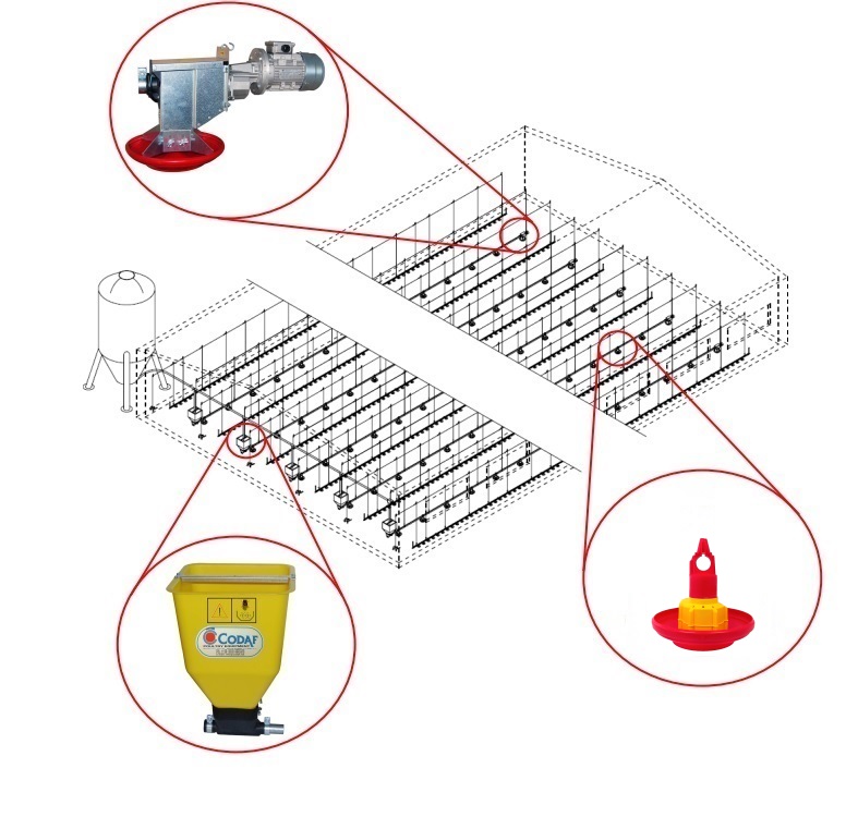 Waterlily feeder for roosters. Not divided into sections. The Codaf rooster feeder is made of high-quality materials that are easy to clean and disinfect. Feeder for reproductive roosters. These types of feeders are used on farms where it is necessary to separate hens from roosters, as well as on professional cardinal farms. The rooster feeder was designed to facilitate the birds' access to feed. The auto feeder does not have dividers, divided racks. In addition, it is equipped with a high cone, which is responsible for the even distribution of feed in the feeder. The feeder is made of materials of the highest quality, which is strong and stable in difficult conditions in poultry. Supply of dry fodder is made unilaterally. From the external hopper to the hoppers (intermediate hoppers), which are located in the poultry house. The auger conveyor, with rotational movements carried out thanks to the electric motor, distributes the fodder in the feeder. The engine is automatically activated by the feed sensor, which is equipped with all feeding lines. As soon as the amount of feed in the feeders decreases, the sensor is activated and they are filled again. Feeding stops when the control feeder is full, so the sensor is able to maintain the feeders full on their own. The mechanism of maximum filling with food ensures a high level of filling of the feeder, then it automatically closes and the level of cream decreases. This makes it possible to reduce feed losses to an absolute minimum. The line with feeders is fixed on a steel cord, freely raised and lowered by a suspension system, which allows farmers to operate the entire feeding line in one movement.Benefits and warranty