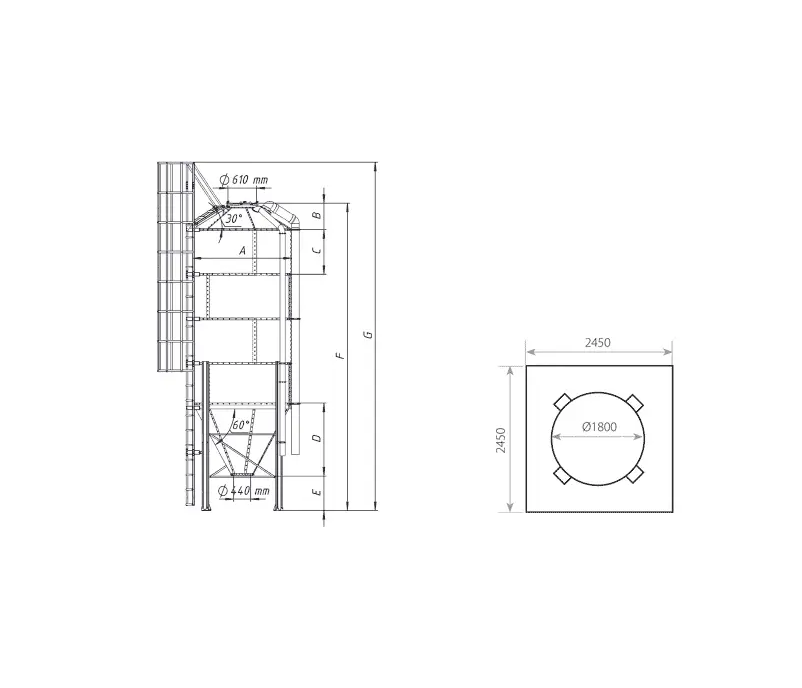 Diameter 1.8 m; Capacity 9 m3; Feed capacity 6 t. The feed hopper is intended only for loading feed with a maximum density of up to 650 kg/m3. The feed hopper must be installed and aligned so that all its legs do not differ in the level of the foundation from one control point by +/- 2 mm. The legs of the assembled hopper must have a perfectly vertical position and be located in a polygon with equal sides and diagonals. Unloading the feed hopper after filling is reduced. Devices that are installed under the cone (between the cone and the floor) cannot be tightly installed, but have telescopic connections with a step of at least 1 cm. Feed hoppers in standard design are intended for installation on load cells with a thick and rigid upper clamping plate. Standard feed hoppers are not intended for installation on forwarding and travel structures, since their design does not provide dynamic gravitational unloading. Standard feed hoppers are intended for temperate climate zones: wind load 30 m/s, snow load 1.2 kN. Feed hoppers are intended for installation by lifting the mounted container to the vertical, but using additional wooden or metal brackets/reinforcements for the legs, described in the instructions.Benefits and warranty