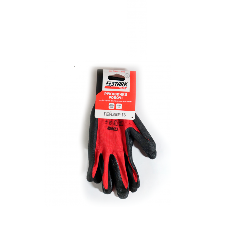 Stark “Geyser-13” gloves with latex coating are universal work gloves with latex coating on the palm area. They are suitable for repair/construction work, gardening, as well as for work in manufacturing, farming, etc. Designed to protect the skin of the hands from minor injuries, scratches that may occur during work, as well as from contamination. Features of Stark Geyser-13 latex-coated work gloves: Knit class – 13, which means that one inch of fabric contains 13 loops, making the fabric very dense. Material – polyester. It is highly durable, wear-resistant, does not stretch, and does not fade. Latex ribbed coating on half of the glove (palm area). Reliable grip in dry and wet environments. Fabric color – red, latex coating color – black. Seamless, ensuring comfort of use. High finger sensitivity is maintained. Size – 10.Benefits and warranty