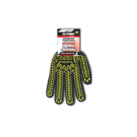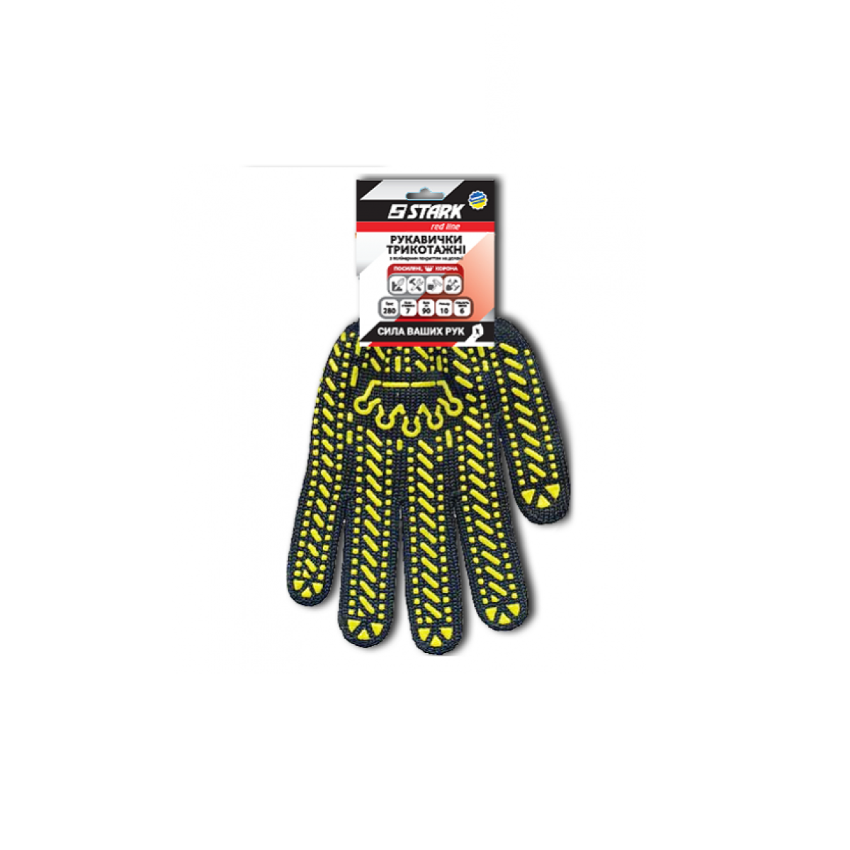 Stark Black Korona - gloves with increased PVC coating to protect hands when performing various mechanical work. Used in construction, repair, and painting work. Manufactured using the “plating” method, whereby cotton threads are placed inside the glove and synthetic threads on top. Thanks to this type of knitting, the gloves are more comfortable to work with and are more wear-resistant. They are made of 60% cotton and 40% polyester. The cuff of the glove has an elastic band that fits comfortably on the hand. To prevent slipping, a large PVC pattern is applied to the working surface. The high density of 280 tex ensures good wear resistance and allows you to work in cold weather. Knitting class 7 means that the gloves are elastic and will fit well on your hands.Benefits and warranty