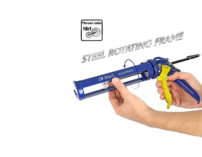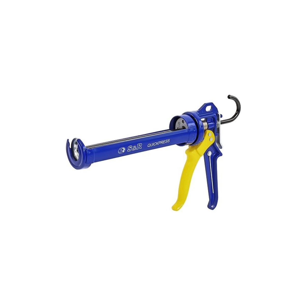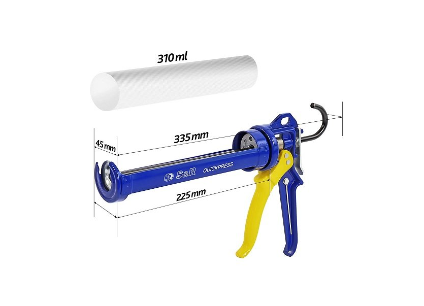The S&R Quick Press 225 mm frame caulking gun is a reliable tool for applying sealants, silicones, adhesives, etc. It is designed for use with standard 310 ml cartridges (tubes). Advantages of the S&R Quick Press frame caulking gun: Made of durable 2 mm thick metal, additionally coated against corrosion. The transmission ratio is 18:1, which allows you to work with different types of materials, including cement, butyl. 360 ° rotating housing to hold cartridges in the correct position. The handle is made of zinc and aluminum alloy, protected from corrosion. Buying a S&R 225 mm frame caulking gun is recommended for professional use.Benefits and warranty