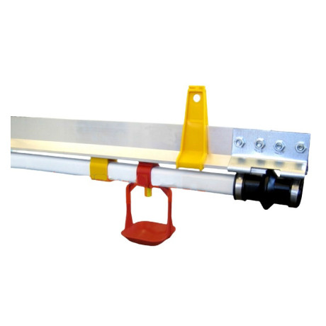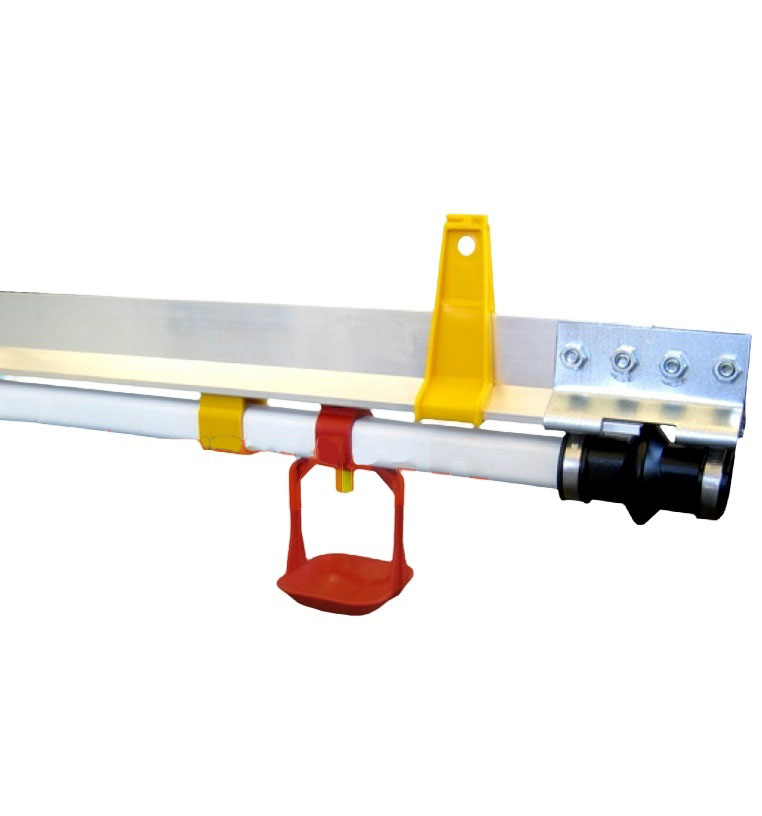 The filling pipe assembly is a plastic pipe with holes, into which nipples (auto-drinkers) are machine-screwed. Drip cups can be attached under the nipples. A coupling made of acid-resistant rubber is installed at the end of each pipe, which connects two adjacent pipes. The coupling is fixed on the pipes with the help of two clamps (clips) made of stainless steel. Because feeding lines at poultry enterprises have a long length (up to 90 m), an aluminum delta profile ("dovetail") or a round galvanized pipe 3/4" is installed on top of the pipe using special fasteners, which provides the necessary rigidity during operation and helps to reduce to A plastic holder with a hole in the upper part is installed on each delta profile. 4032 Pouring pipe 22x22 mm, length 3 (three) meters, with 8 top combinipels (art. 4024-00) and with small drip cups (art. 4612-01) 4033 Filling pipe 22x22 mm, length 3 (three) meters, with 10 top-combiBenefits and warranty