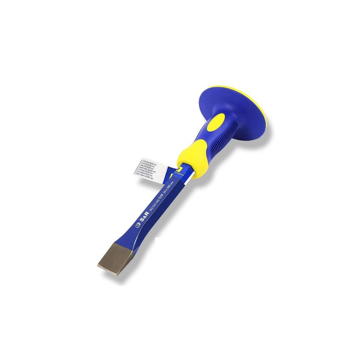 Hand chisel S & R 25x300 mm - a flat chisel for manual work, which will help to split objects, remove baseboards, tiles, separate boards, chip stone and other repair and construction work. The working part is flat, made of chrome-vanadium steel with thermal hardening, due to which the chisel has a long service life and performs its work qualitatively. Due to forging, the steel has a hardness of 52-58 HRC, which allows the tool to withstand heavy loads. Equipped with an ergonomic handle with special spikes that prevent the hand from slipping during work. The handle is widened to the end and protects the hand during hammer blows. For blows, a steel tip is provided that can withstand high impact force.Benefits and warranty