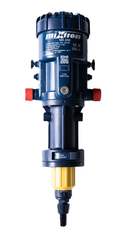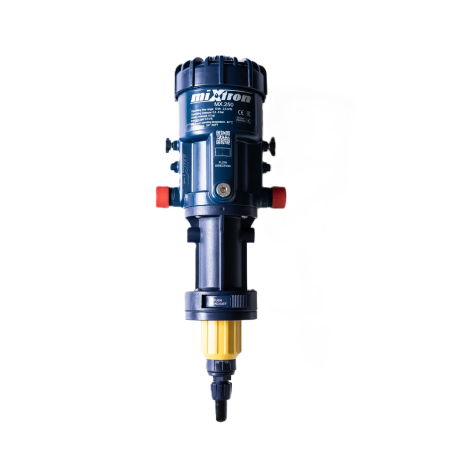 The Mixtron MX.250.P054 is a high-precision medication dispenser that operates exclusively on water pressure (0.3 to 6 bar) and does not require an electrical supply. Its flexible dosing ratio in the range of 0.5 - 4% ensures efficient mixing of liquid medicines with water regardless of the flow rate.
