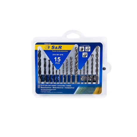 The S&R Meister drill set of 15 pieces is designed for drilling metal, concrete, and wooden surfaces. The S&R Meister drill set includes: Wood drill bits 5 pieces with diameters: 3, 4, 5, 6, 8 mm; Metal drill bits 5 pieces with diameters: 3, 4, 5, 6, 8 mm; Concrete drill bits 5 pieces with diameters: 3, 4, 5, 6, 8 mm. Each drill bit is made of high-quality steel and is treated against corrosion. The set comes in a blister pack. Suitable for use with popular drill models. Buying a set of S&R Meister drill bits is recommended for amateur or professional work.Benefits and warranty