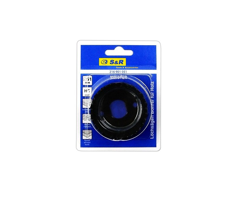 S & R Meister 51 mm - a circular saw for drilling holes in wood. The circular saw for wood is used both in the furniture industry and in repair and construction. The circular saw is made of high-carbon steel, which makes it highly durable and wear-resistant. Sharp teeth easily cut through wood, as well as all wood-containing materials: drywall, plywood, chipboard, fiberboard, MDF. The integrity of the crown ensures even edges for the hole. The circular saw S & R Meister 51 mm allows you to quickly drill holes in wood with a drill or other drilling rigs.Benefits and warranty