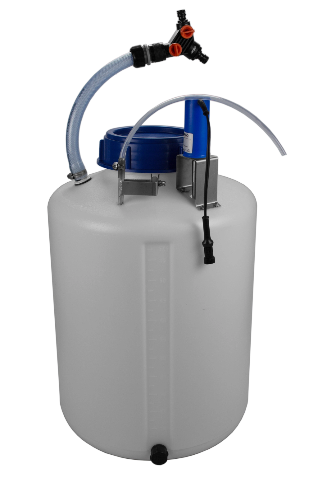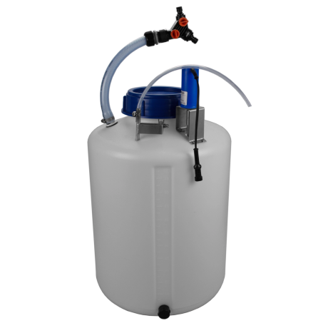 Stainless steel faucet and suction pipe, LDPE tank incl. 24V power supply and timer. The interior floor is inclined by 5°, the contents can be used more efficiently. Weight 6 kg.Benefits and warranty