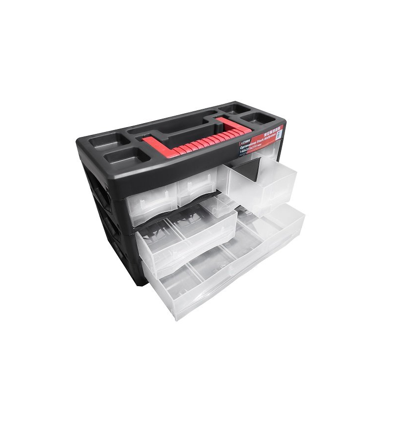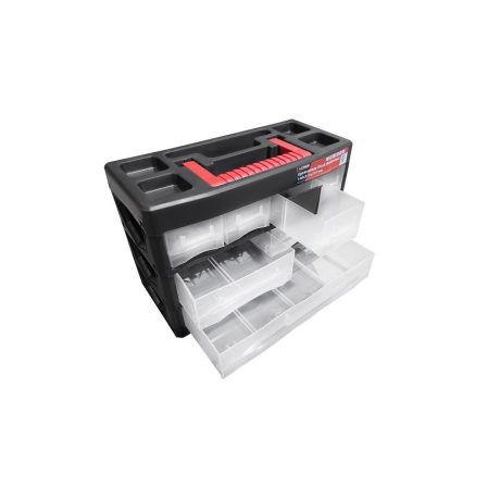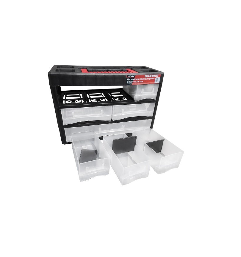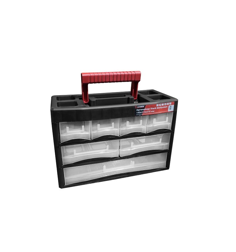 Stark BinSystem 140x315x210 mm tool organizer – a system for convenient storage of small parts, fasteners, tools, and other small items. Includes 7 pull-out drawers that can be divided with special insertable dividers (included) according to the user's preferences. Other features of the Stark BinSystem 140x315x210 mm tool organizer: Made of durable plastic. The boxes are made of transparent plastic, allowing the user to quickly find the right tool without opening the drawer. Each block has a recessed handle for ease of use. The organizer is installed vertically. At the top, on the lid of the organizer, there is a convenient folding handle for easy transportation of the entire storage system. The lid has several recesses for small tools, where the user can place the items they need while working. Dimensions: 140x315x210 mm.Benefits and warranty