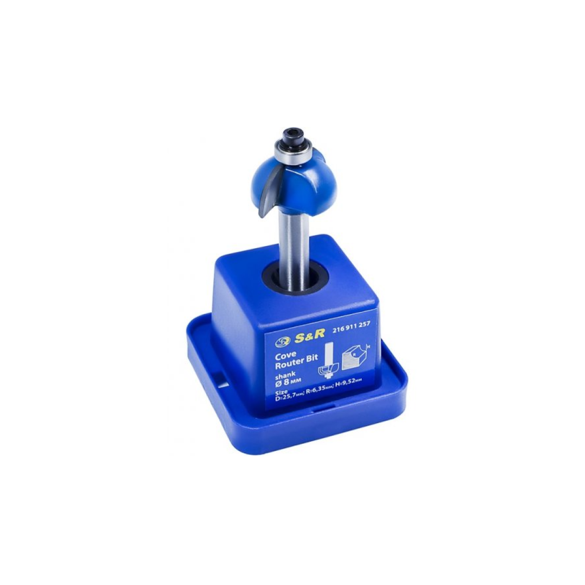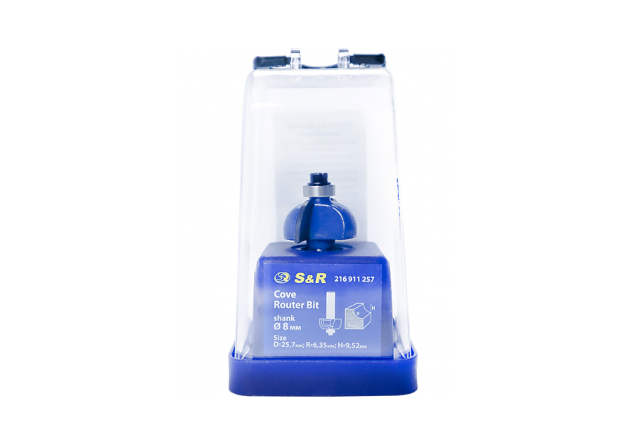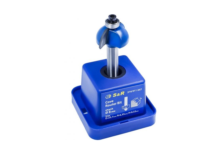 S&R wood router bit 25.7x6.35x9.52mm, shank.8mm - designed for working with wood (spruce, beech, oak, alder), plywood, chipboard, fiberboard, MDF. Suitable for: making edge profiles, hinged joints with flutes; milling decorative grooves and grooves; structuring surfaces; use in copy milling machines. Dimensions: Shank diameter - 8 mm; Working part height - 9.52 mm; Diameter - 25.7 mm. Shank type - cylindrical. Supplied in individual plastic packaging. Country of manufacture: China. Country of brand: Germany.Benefits and warranty