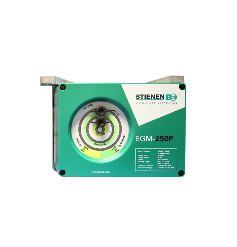 The EGM motors have been specially developed to control air inlet systems in intensive livestock buildings. They are fitted with robust brushless 24V motors with a tensile force of 100 and 250 kg respectively. The integrated microprocessor continuously monitors the maximum torque preventing damage due to overload. The EGM can be adjusted without tools and without opening it, thus ensuring a long service life and splash water tightness. As standard, the EGM series is supplied with a cable drum and is available with a 0-10V control signal or potentiometer feedback. The intelligent DMS-24-2CA or DMS-24-AM end station can control the EGM-CA motor and feedback its exact position by means of communication through a single cable. This minimises the need of wiring, resulting in attractive cost savings.Benefits and warranty