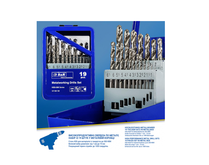Reviews Set of 19 drill bits: 1.0-10.0 mm, HSS, for metal with a hardness of up to 250 Bhn, in a metal case S&R (107809190)