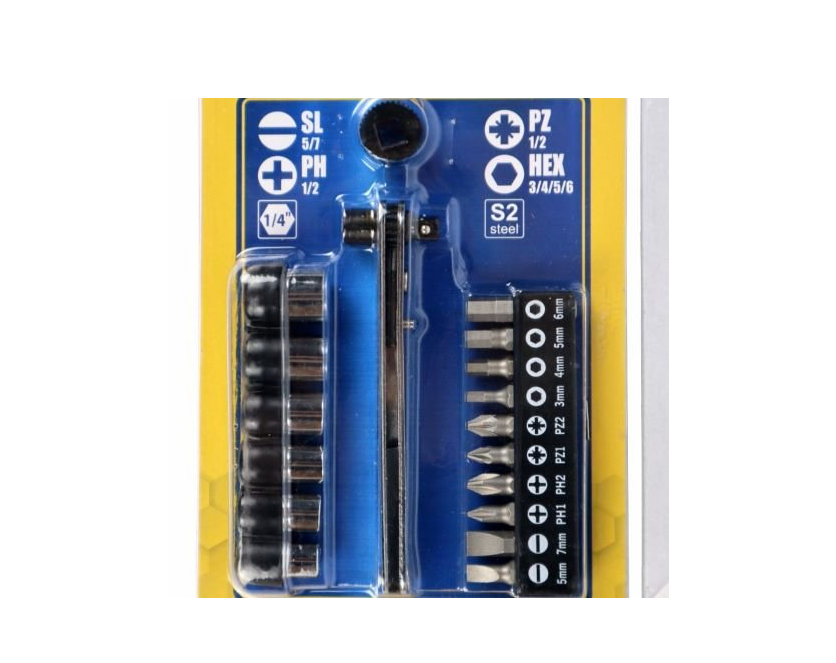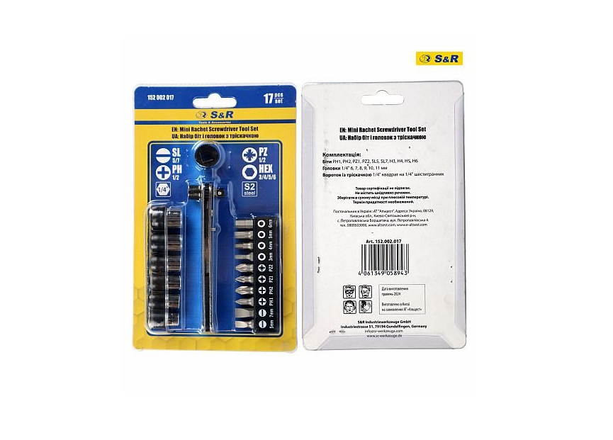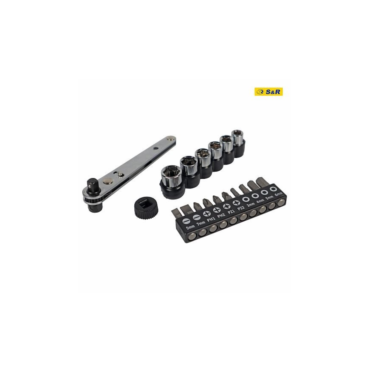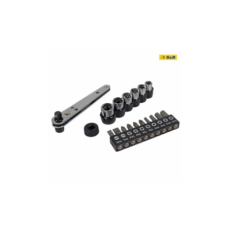 S&R 17-piece ratchet bit and socket set - includes a ratchet wrench, 10 bits and 6 sockets. Package contents: 25 mm bits: PH1, PH2, PZ1, PZ2, SL5, SL7, H3, H4, H5, H6. Sockets ¼": 6, 7, 8, 9, 10, 11 mm. Ratchet wrench. Features of the 17-piece SR bit and socket set: Made of durable steel. Country of manufacture: Taiwan. Country of brand: Germany.Benefits and warranty