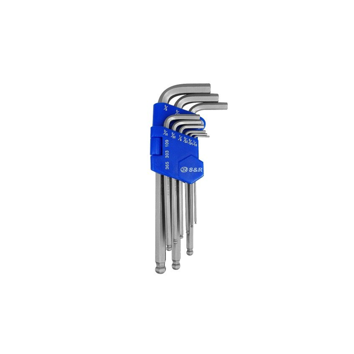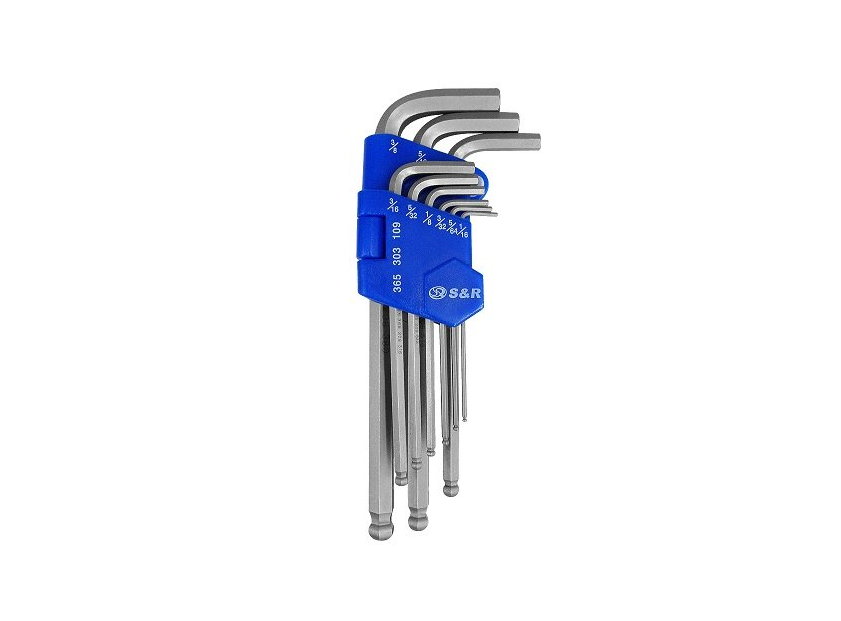 Set of S & R hex keys for assembly mechanical production, maintenance stations. Material - chrome-vanadium steel. Surface treatment - matt. Design features - chrome-nickel coating. Working diameter - 1/16; 5/64; 3/32; 1/8; 5/32; 3/16; 1/4; 5/16; 3/8 'Benefits and warranty