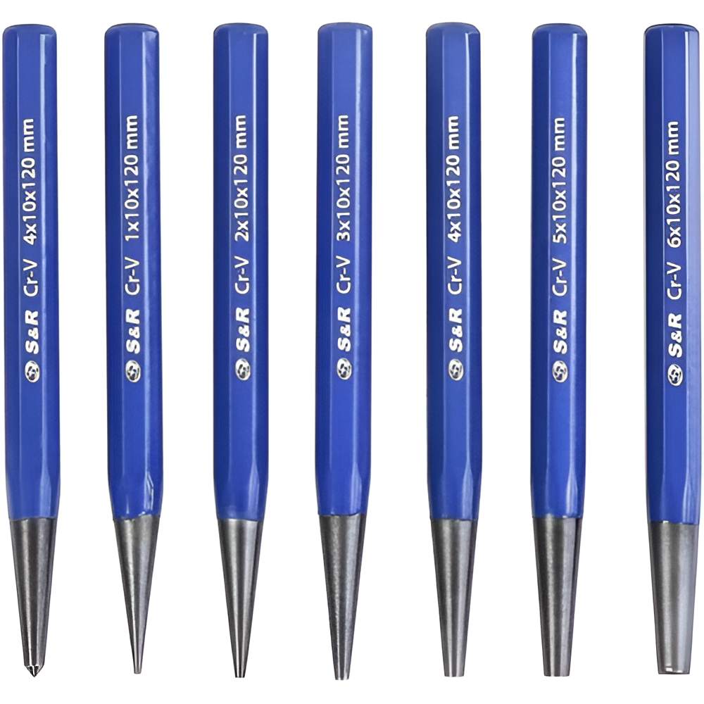 The S&R Punch Set + Core 7-Piece is a set of tools for punching out fasteners that cannot be removed in the usual way. The set also includes a punch for marking workpieces. Features of the SR punch set. The set includes 6 picks and 1 core. Picks of popular diameters: 1/2/3/4/5/6 mm. The core has a diameter of 4 mm. The tools in the set are made of hardened chrome vanadium steel with a hardness of 58-60 HRC. It is treated against corrosion. The dimensions of the punch / core are 10x120 mm.Benefits and warranty